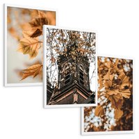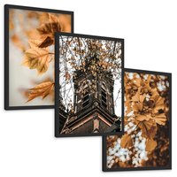 Zestaw obrazy w ramie, plakaty - liście, jesień, budynek