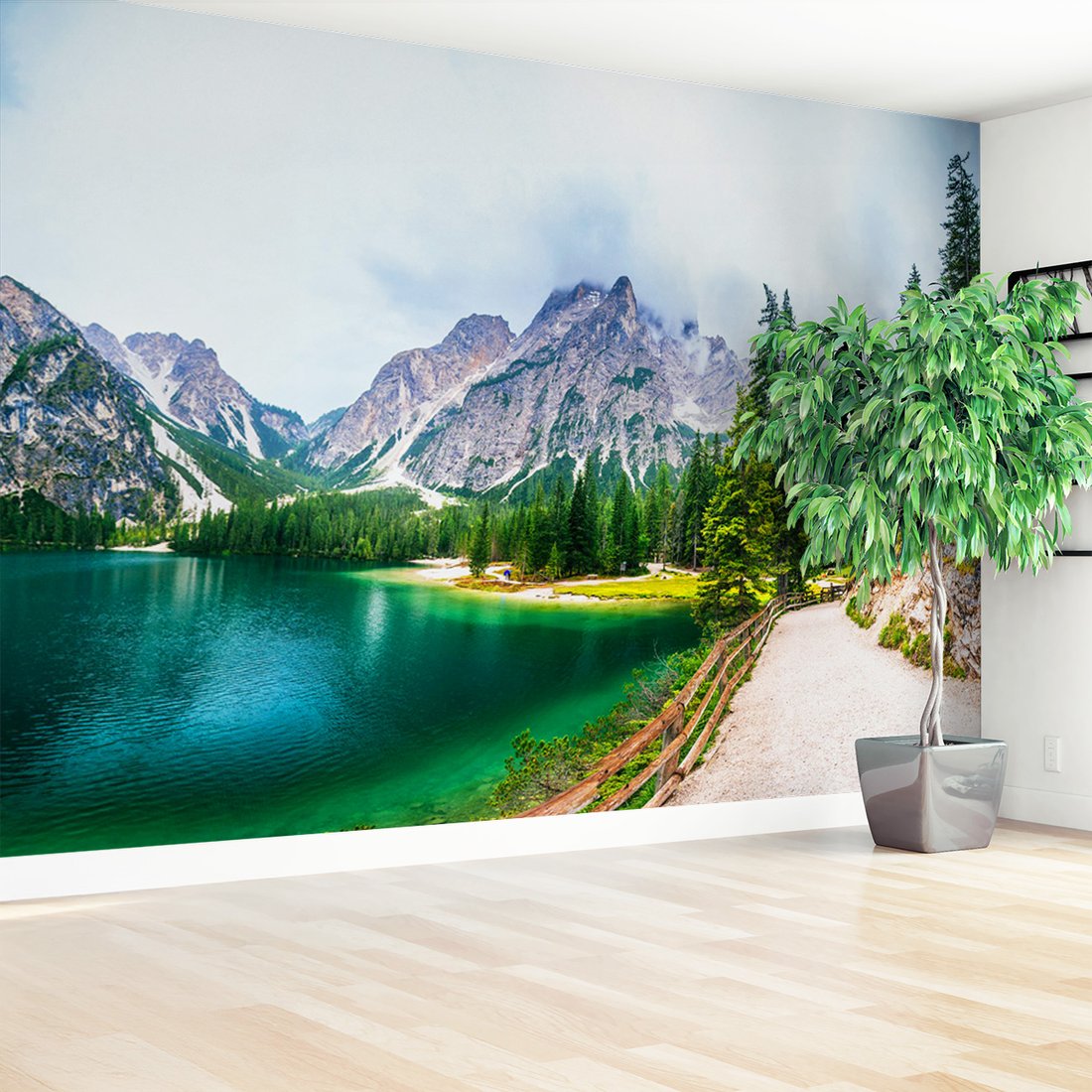 Nadaj swojemu wnętrzu unikalny charakter i głębię dzięki naszej fototapecie z motywem jezioro, góry, lasy. Ta imponująca dekoracja ścienna to połączenie nowoczesnego designu i zapierającego dech w piersiach motywu, które całkowicie odmieni Twoje pomieszczenie