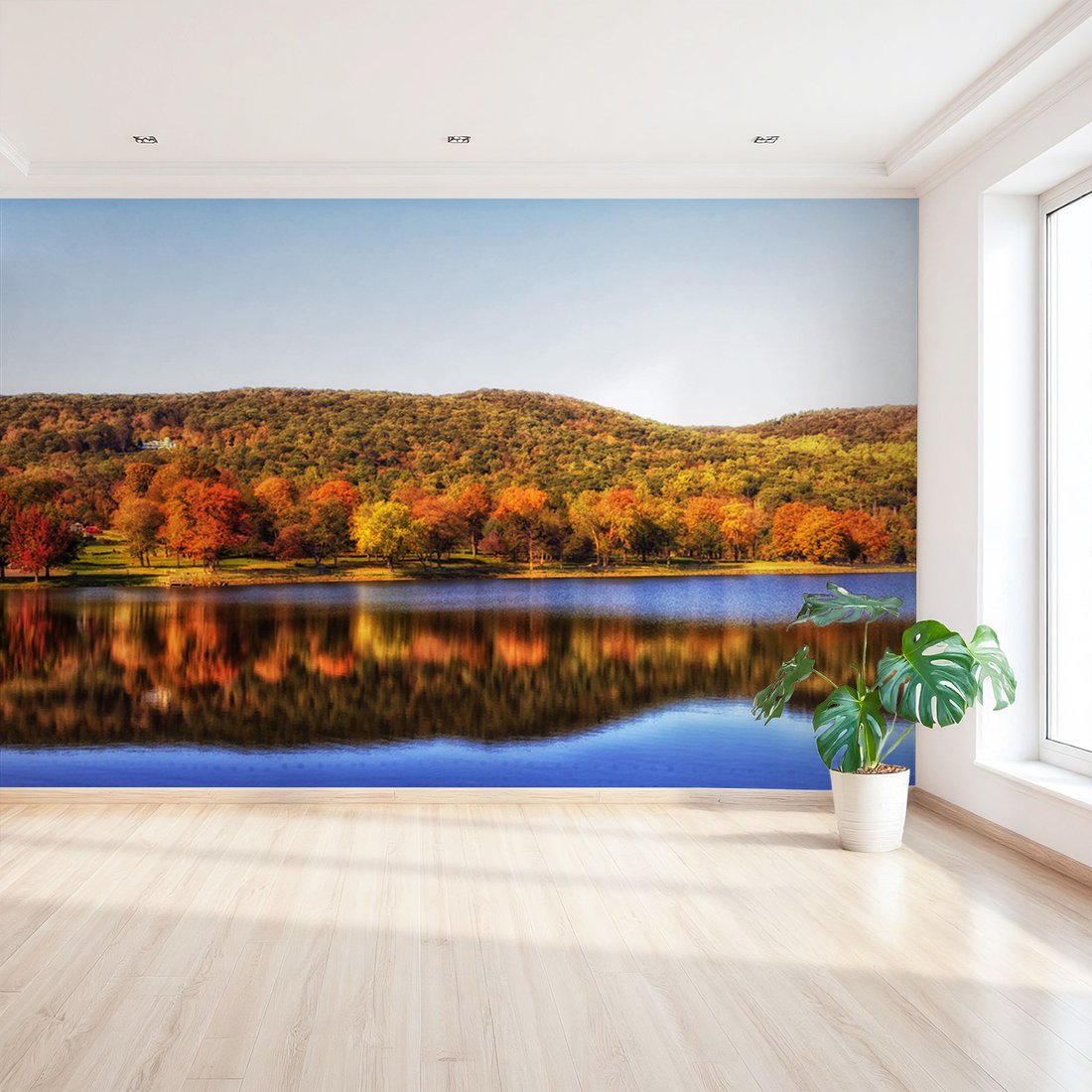 Nadaj swojemu wnętrzu unikalny charakter i głębię dzięki naszej fototapecie z motywem jezioro, las, jesień. Ta imponująca dekoracja ścienna to połączenie nowoczesnego designu i zapierającego dech w piersiach motywu, które całkowicie odmieni Twoje pomieszczenie