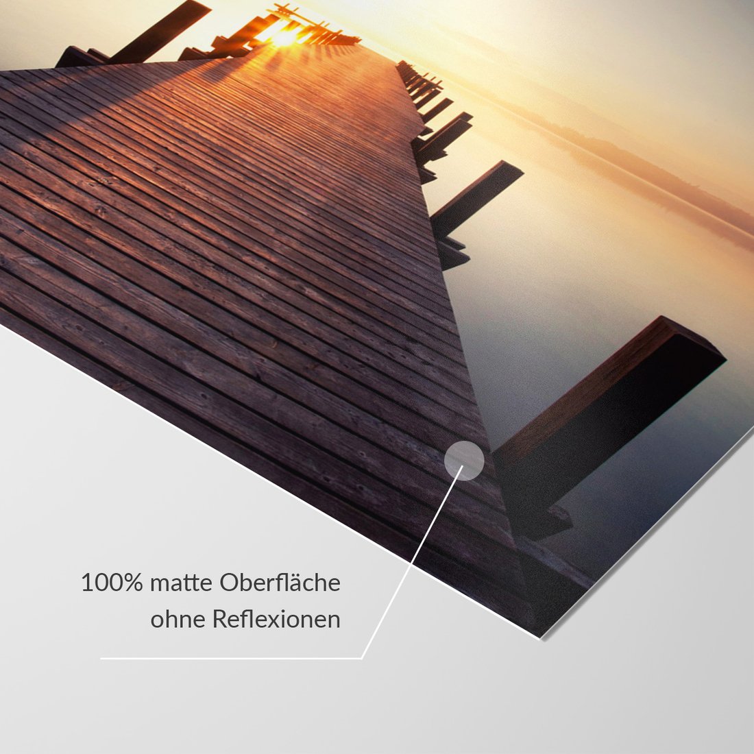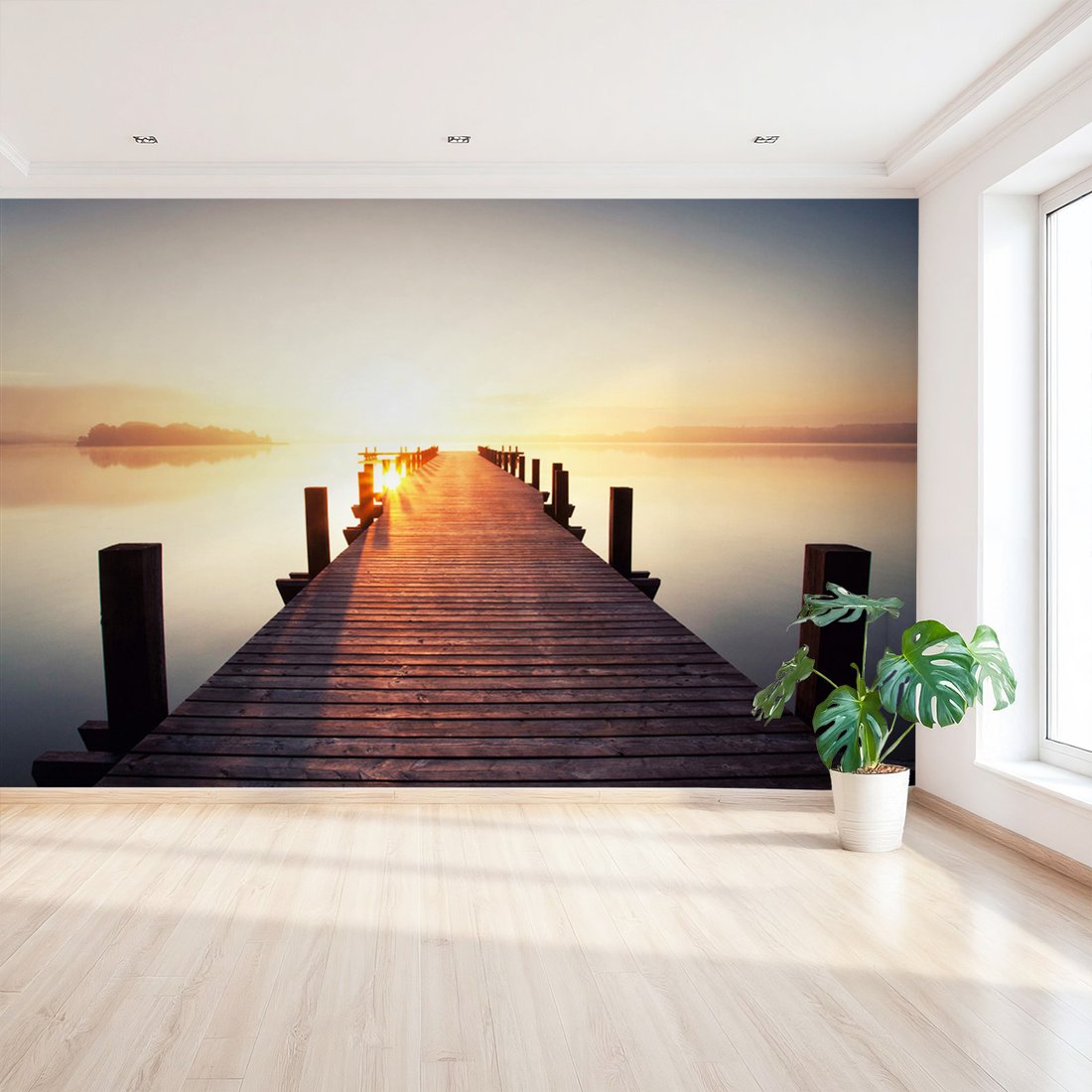 Nadaj swojemu wnętrzu unikalny charakter i głębię dzięki naszej fototapecie z motywem jezioro, pomost, wschód słońca. Ta imponująca dekoracja ścienna to połączenie nowoczesnego designu i zapierającego dech w piersiach motywu, które całkowicie odmieni Twoje pomieszczenie