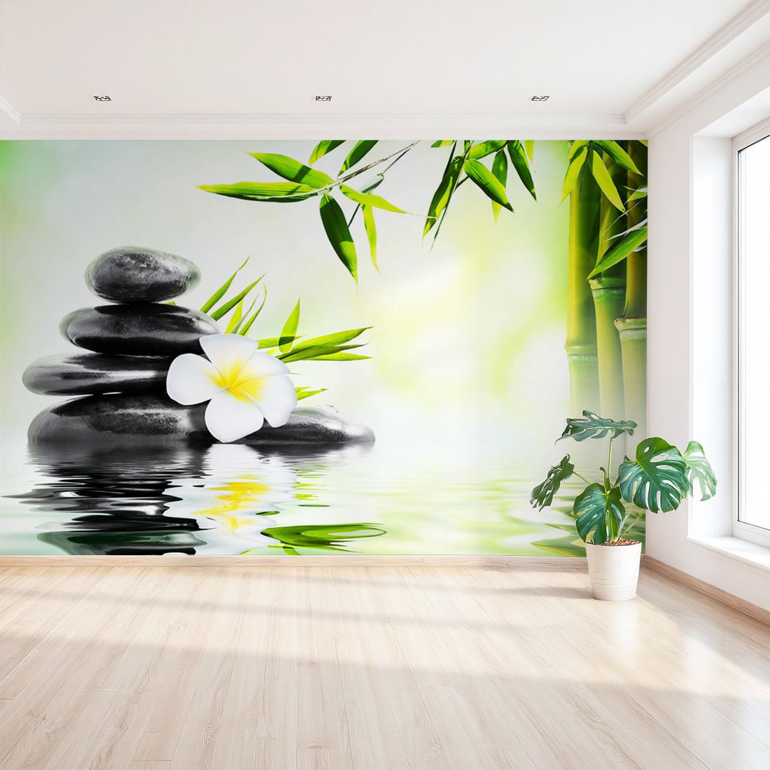 Nadaj swojemu wnętrzu unikalny charakter i głębię dzięki naszej fototapecie z motywem kamienie, bambus, kwiat. Ta imponująca dekoracja ścienna to połączenie nowoczesnego designu i zapierającego dech w piersiach motywu, które całkowicie odmieni Twoje pomieszczenie