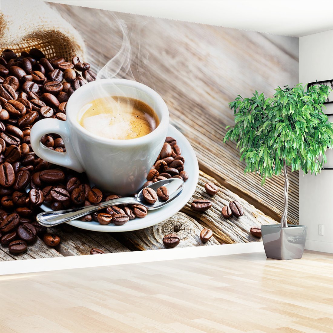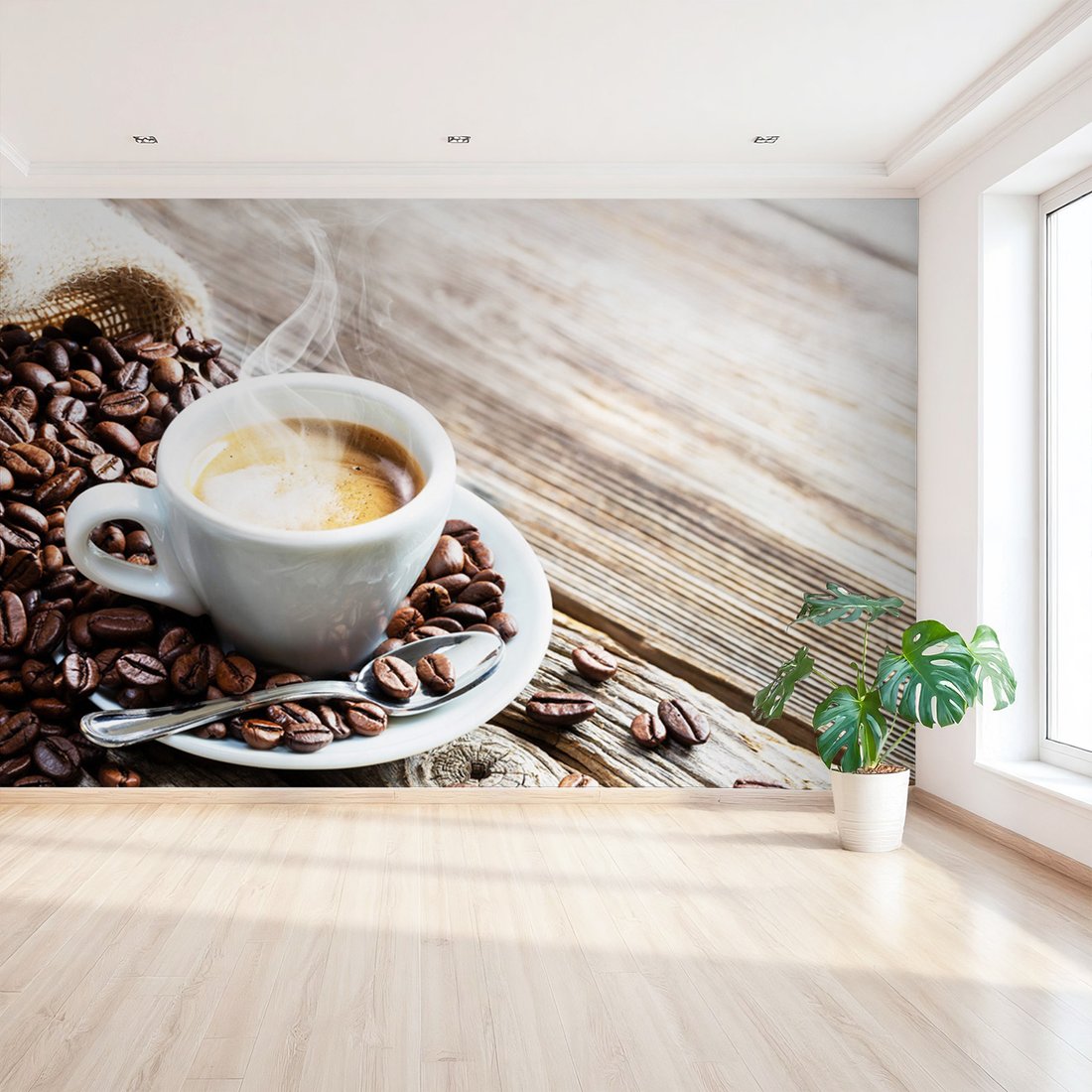 Nadaj swojemu wnętrzu unikalny charakter i głębię dzięki naszej fototapecie z motywem kawa, ziarna, filiżanka. Ta imponująca dekoracja ścienna to połączenie nowoczesnego designu i zapierającego dech w piersiach motywu, które całkowicie odmieni Twoje pomieszczenie