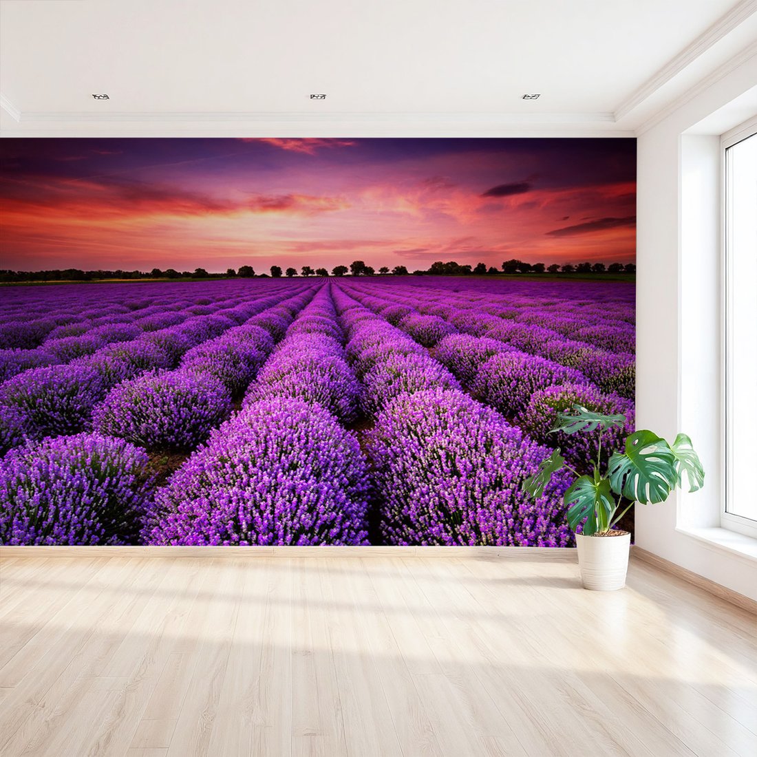 Nadaj swojemu wnętrzu unikalny charakter i głębię dzięki naszej fototapecie z motywem lawenda, pole, zachód słońca. Ta imponująca dekoracja ścienna to połączenie nowoczesnego designu i zapierającego dech w piersiach motywu, które całkowicie odmieni Twoje pomieszczenie