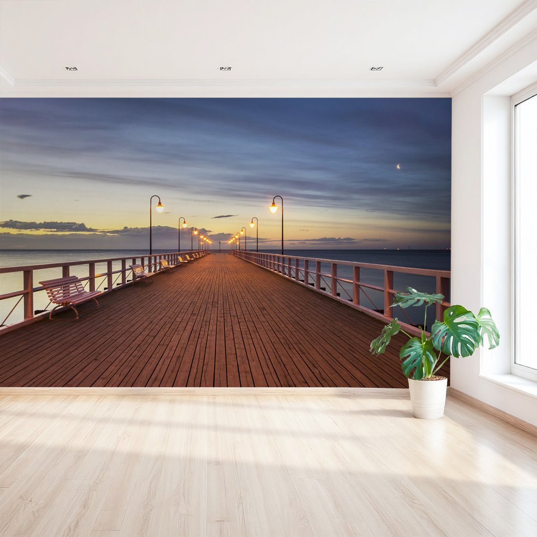 Nadaj swojemu wnętrzu unikalny charakter i głębię dzięki naszej fototapecie z motywem morze, molo, wieczór. Ta imponująca dekoracja ścienna to połączenie nowoczesnego designu i zapierającego dech w piersiach motywu, które całkowicie odmieni Twoje pomieszczenie