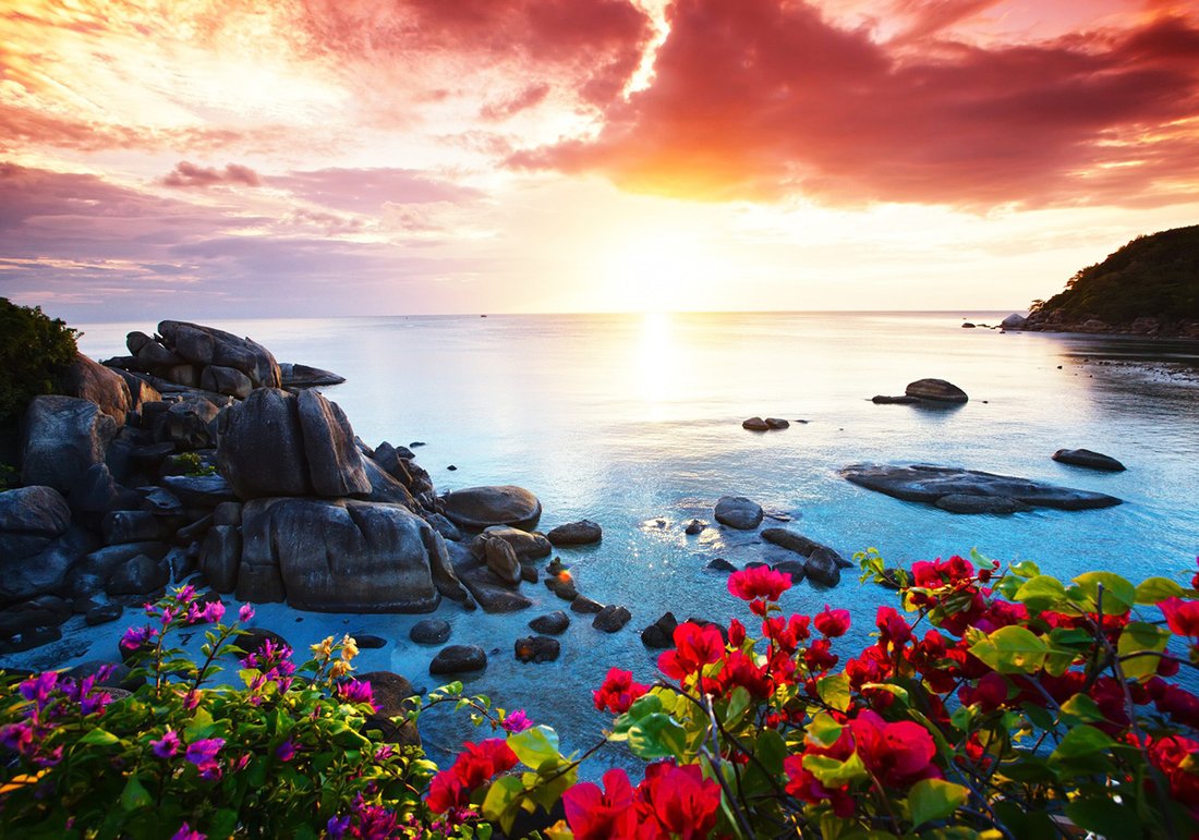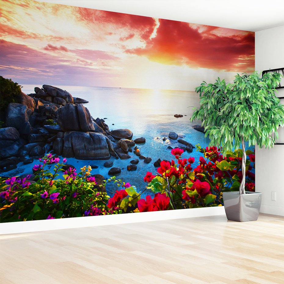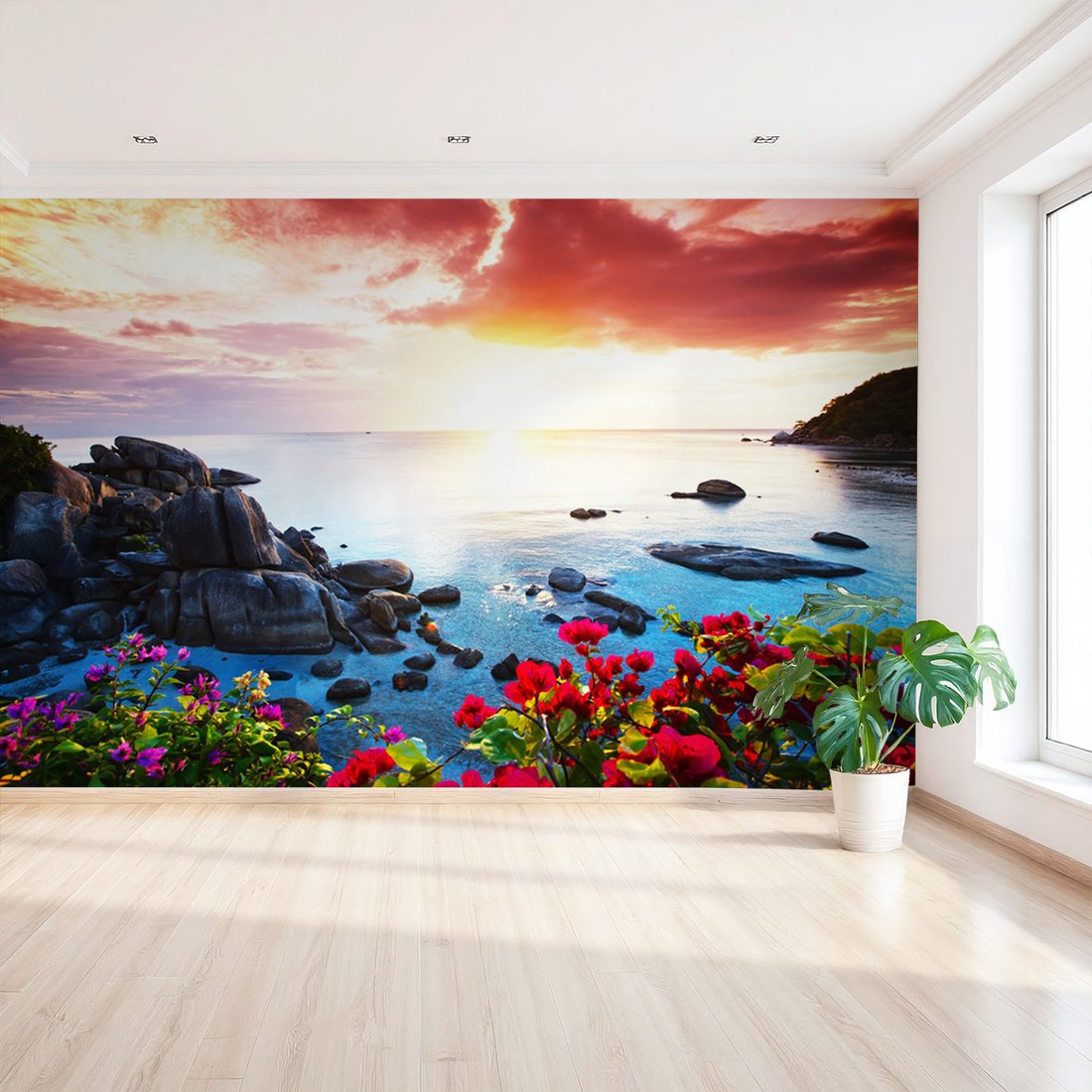 Nadaj swojemu wnętrzu unikalny charakter i głębię dzięki naszej fototapecie z motywem morze, skały, kwiaty. Ta imponująca dekoracja ścienna to połączenie nowoczesnego designu i zapierającego dech w piersiach motywu, które całkowicie odmieni Twoje pomieszczenie