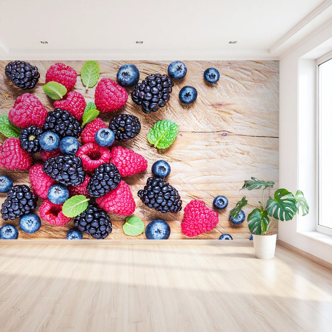 Nadaj swojemu wnętrzu unikalny charakter i głębię dzięki naszej fototapecie z motywem owoce, jagody, maliny. Ta imponująca dekoracja ścienna to połączenie nowoczesnego designu i zapierającego dech w piersiach motywu, które całkowicie odmieni Twoje pomieszczenie