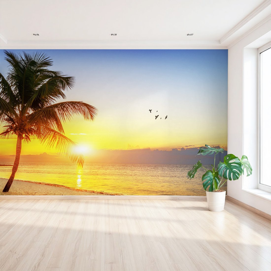 Nadaj swojemu wnętrzu unikalny charakter i głębię dzięki naszej fototapecie z motywem palma, morze, zachód słońca. Ta imponująca dekoracja ścienna to połączenie nowoczesnego designu i zapierającego dech w piersiach motywu, które całkowicie odmieni Twoje pomieszczenie