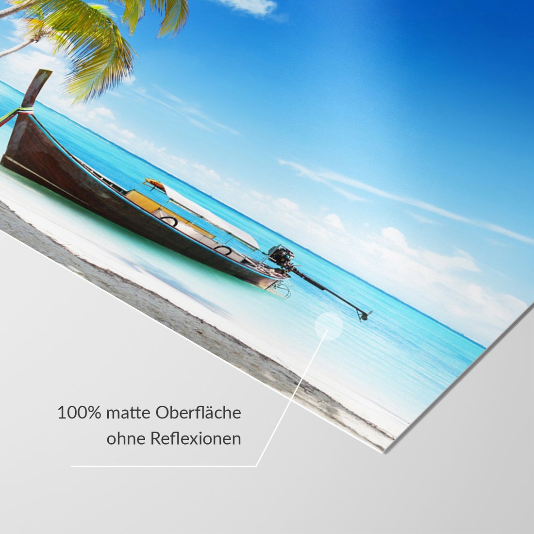 Nadaj swojemu wnętrzu unikalny charakter i głębię dzięki naszej fototapecie z motywem plaża, palmy, łódź. Ta imponująca dekoracja ścienna to połączenie nowoczesnego designu i zapierającego dech w piersiach motywu, które całkowicie odmieni Twoje pomieszczenie