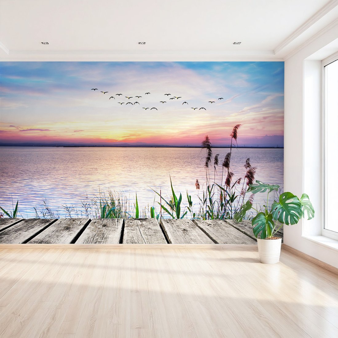 Nadaj swojemu wnętrzu unikalny charakter i głębię dzięki naszej fototapecie z motywem zachód słońca, jezioro, ptaki. Ta imponująca dekoracja ścienna to połączenie nowoczesnego designu i zapierającego dech w piersiach motywu, które całkowicie odmieni Twoje pomieszczenie