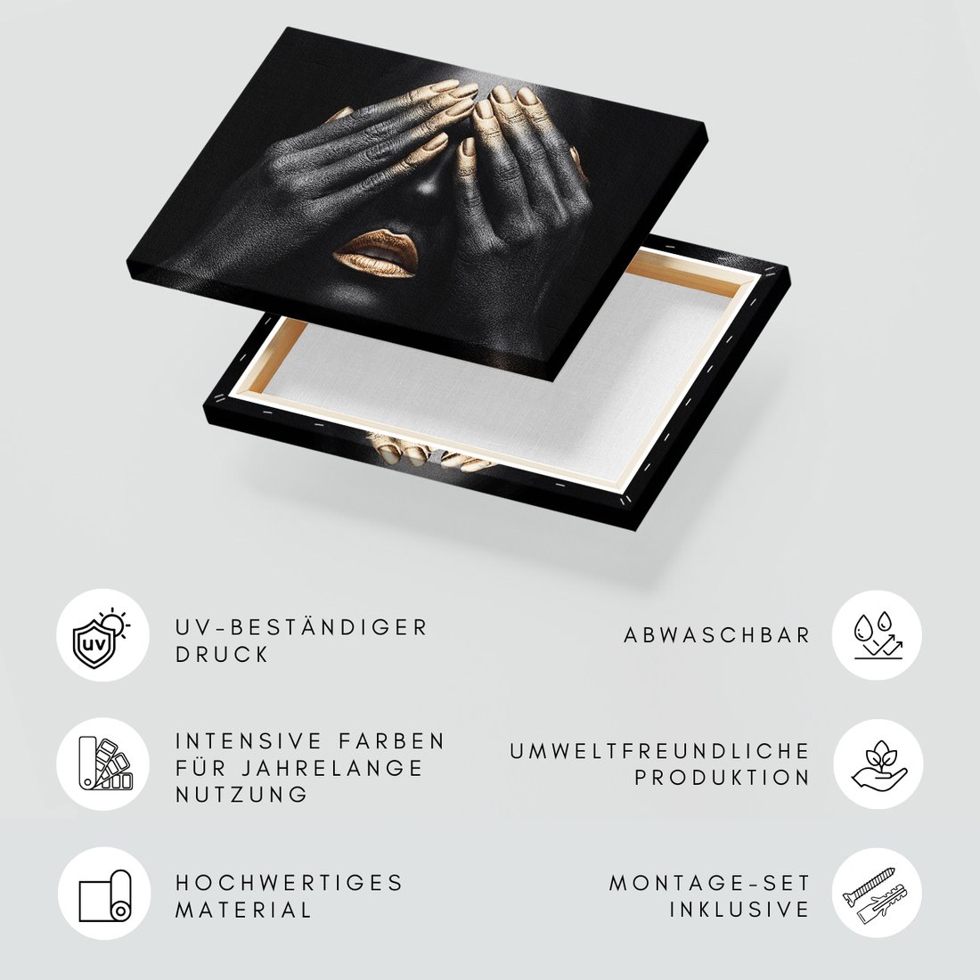 Obraz na płótnie z motywem abstrakcja, złoto, ręce to kwintesencja estetyki i trwałości. Dzięki łatwemu montażowi i uniwersalnemu wzornictwu, czyni go idealnym wyborem zarówno do codziennego użytku, jak i na wyrafinowany prezent.