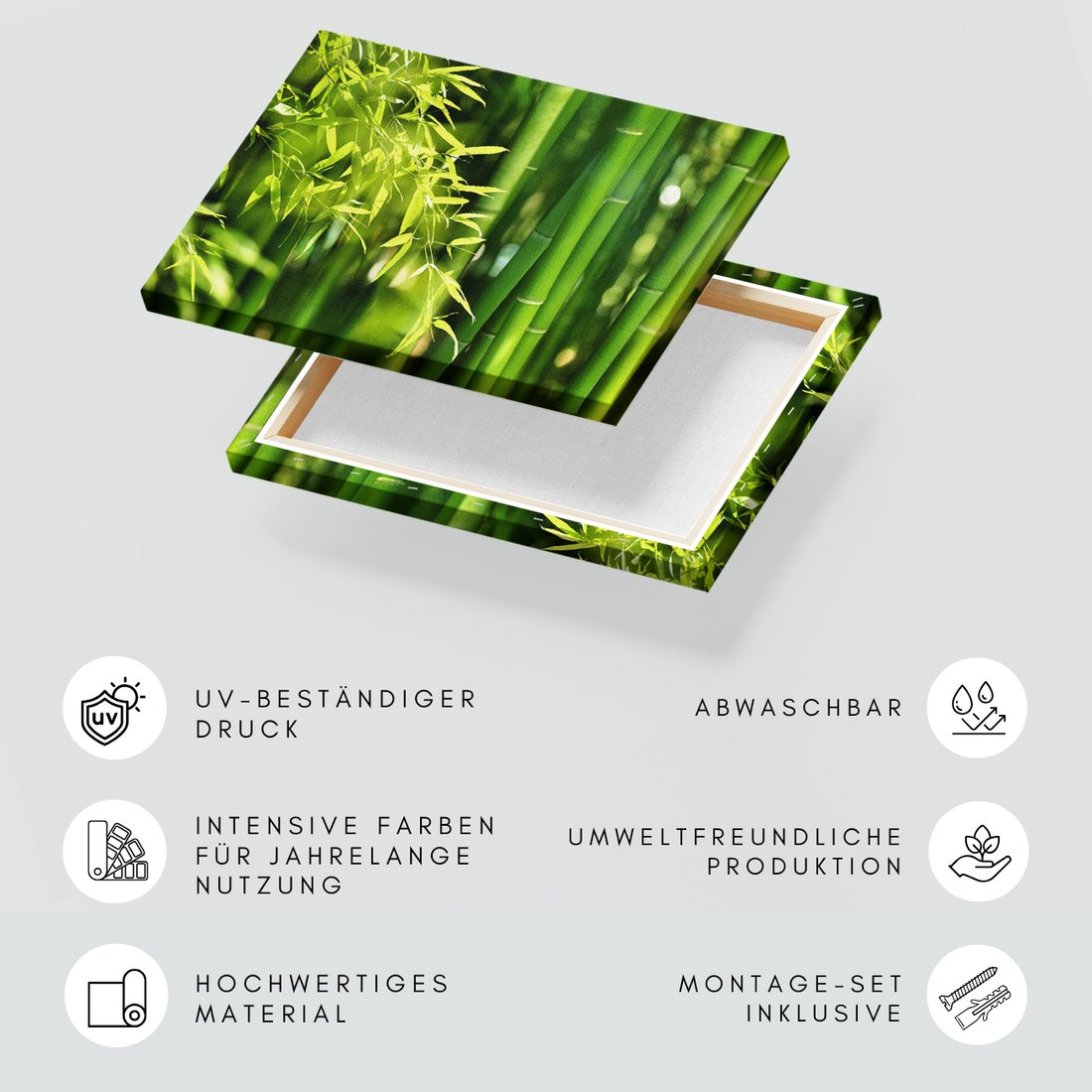 Obraz na płótnie z motywem bambus, liście, zieleń to kwintesencja estetyki i trwałości. Dzięki łatwemu montażowi i uniwersalnemu wzornictwu, czyni go idealnym wyborem zarówno do codziennego użytku, jak i na wyrafinowany prezent.