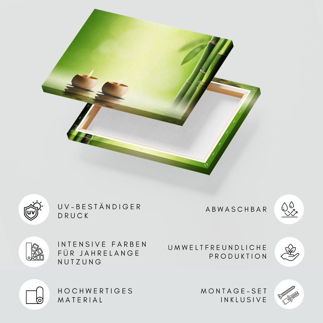 Obraz na płótnie z motywem bambus, świece, relaks to kwintesencja estetyki i trwałości. Dzięki łatwemu montażowi i uniwersalnemu wzornictwu, czyni go idealnym wyborem zarówno do codziennego użytku, jak i na wyrafinowany prezent.