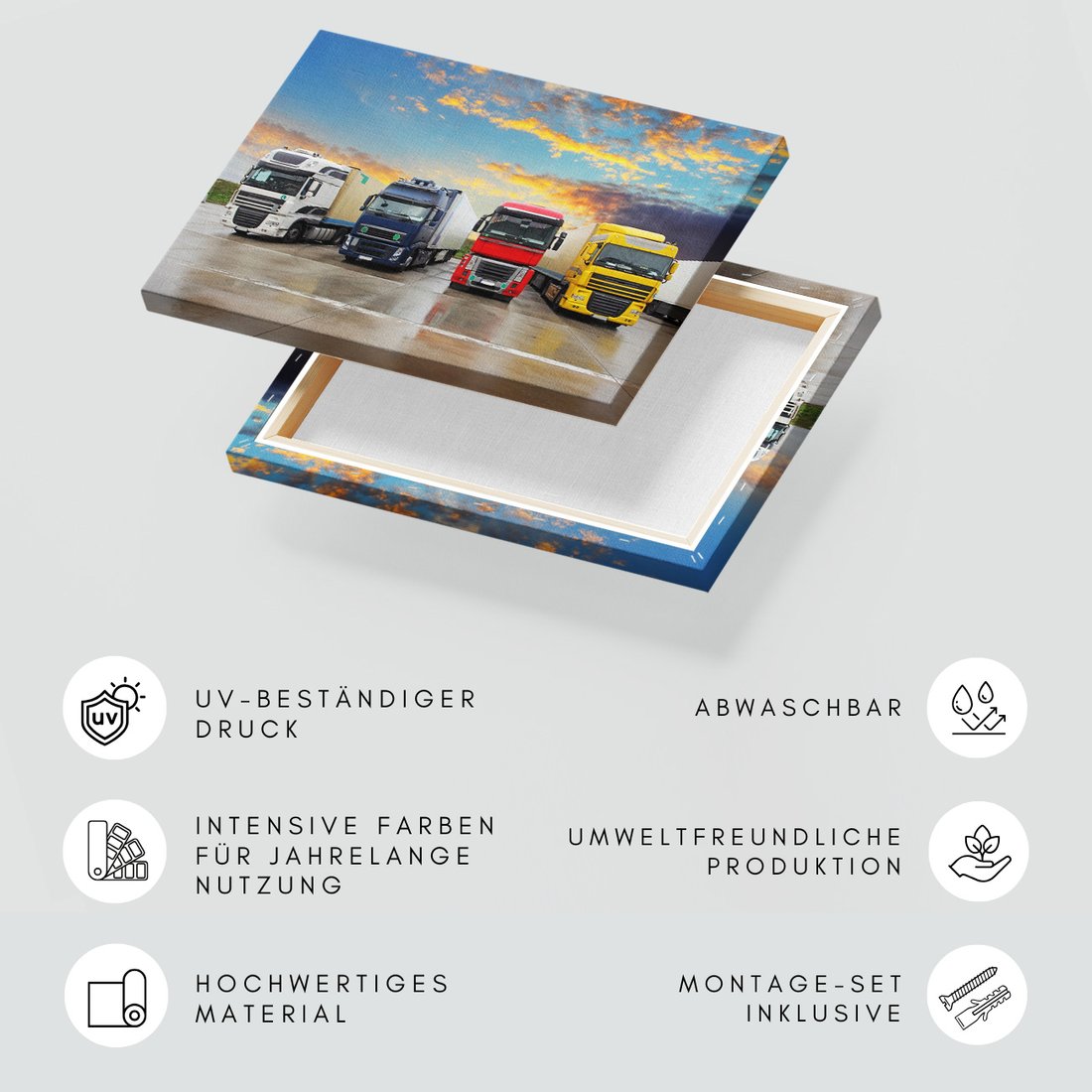 Obraz na płótnie z motywem ciężarówki, transport, niebo to kwintesencja estetyki i trwałości. Dzięki łatwemu montażowi i uniwersalnemu wzornictwu, czyni go idealnym wyborem zarówno do codziennego użytku, jak i na wyrafinowany prezent.