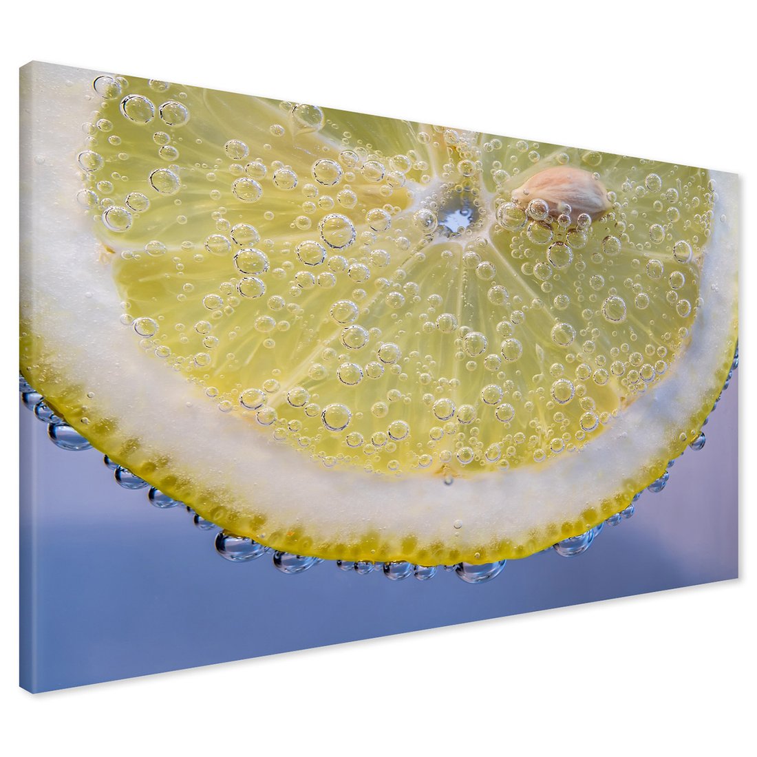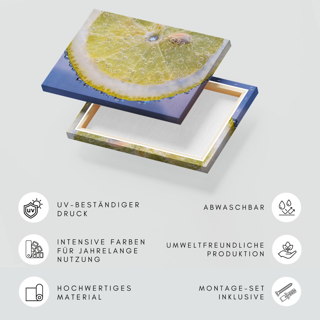 Obraz na płótnie z motywem cytryna, bąbelki, napój to kwintesencja estetyki i trwałości. Dzięki łatwemu montażowi i uniwersalnemu wzornictwu, czyni go idealnym wyborem zarówno do codziennego użytku, jak i na wyrafinowany prezent.