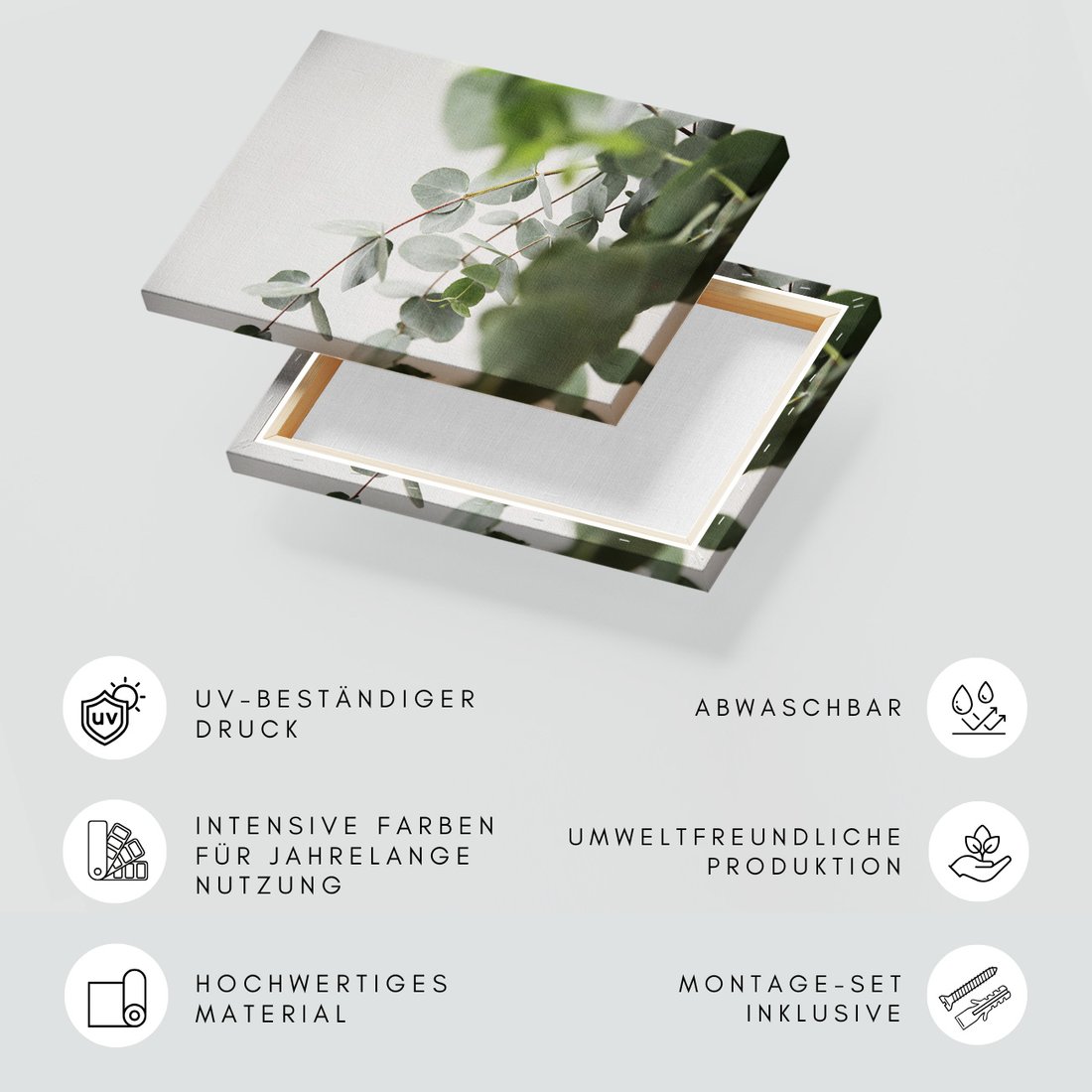 Obraz na płótnie z motywem eukaliptus, liście, natura to kwintesencja estetyki i trwałości. Dzięki łatwemu montażowi i uniwersalnemu wzornictwu, czyni go idealnym wyborem zarówno do codziennego użytku, jak i na wyrafinowany prezent.