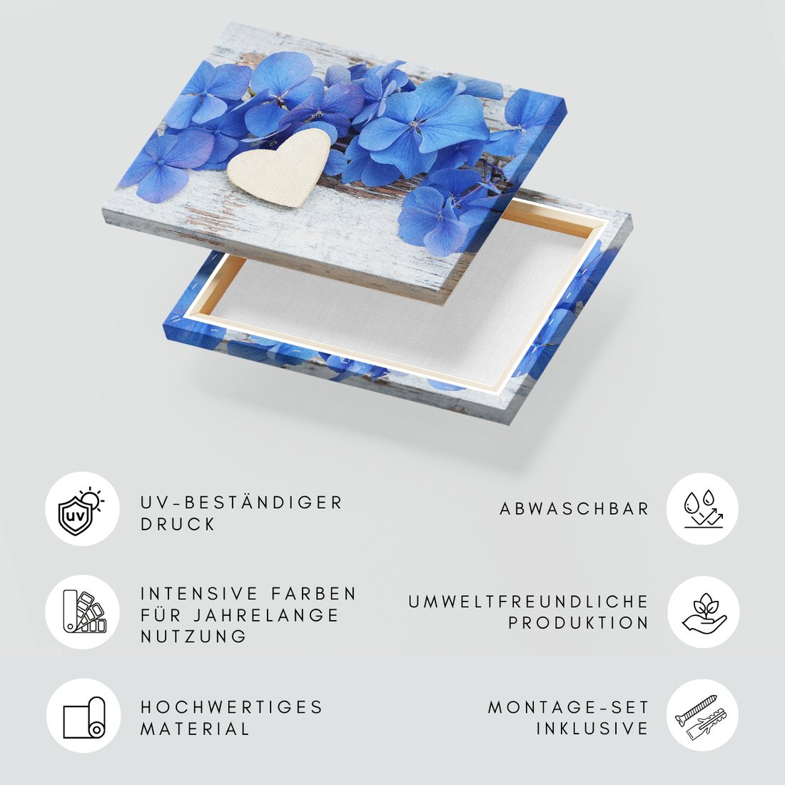 Obraz na płótnie z motywem hortensje, kwiaty, serce to kwintesencja estetyki i trwałości. Dzięki łatwemu montażowi i uniwersalnemu wzornictwu, czyni go idealnym wyborem zarówno do codziennego użytku, jak i na wyrafinowany prezent.