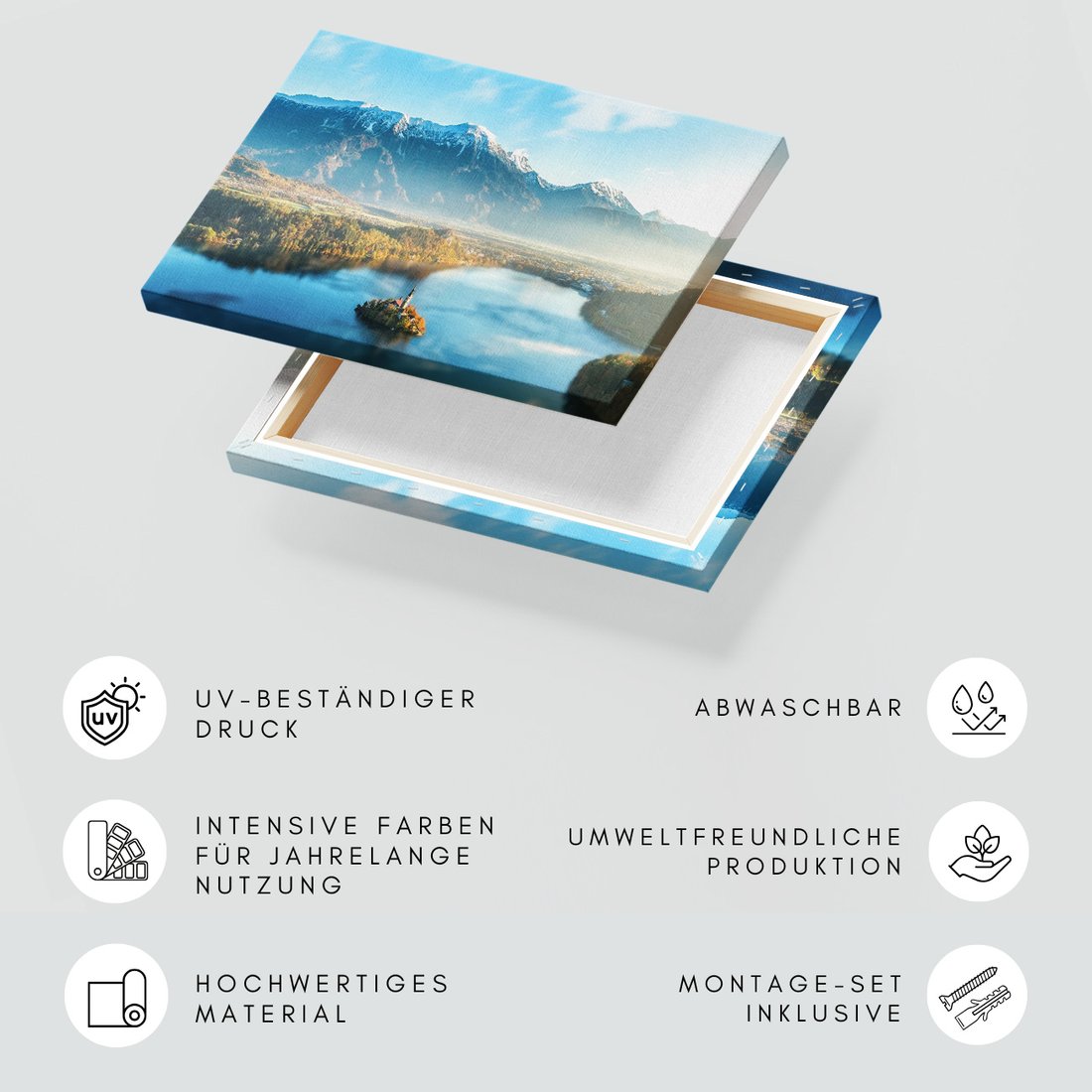 Obraz na płótnie z motywem jezioro, góry, wyspa to kwintesencja estetyki i trwałości. Dzięki łatwemu montażowi i uniwersalnemu wzornictwu, czyni go idealnym wyborem zarówno do codziennego użytku, jak i na wyrafinowany prezent.
