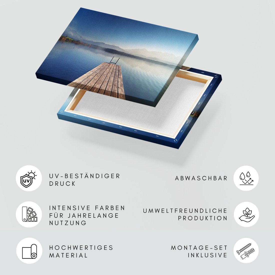 Obraz na płótnie z motywem jezioro, molo, góry to kwintesencja estetyki i trwałości. Dzięki łatwemu montażowi i uniwersalnemu wzornictwu, czyni go idealnym wyborem zarówno do codziennego użytku, jak i na wyrafinowany prezent.
