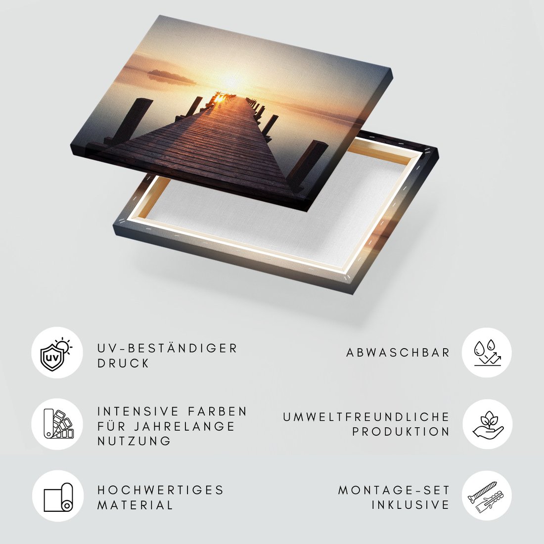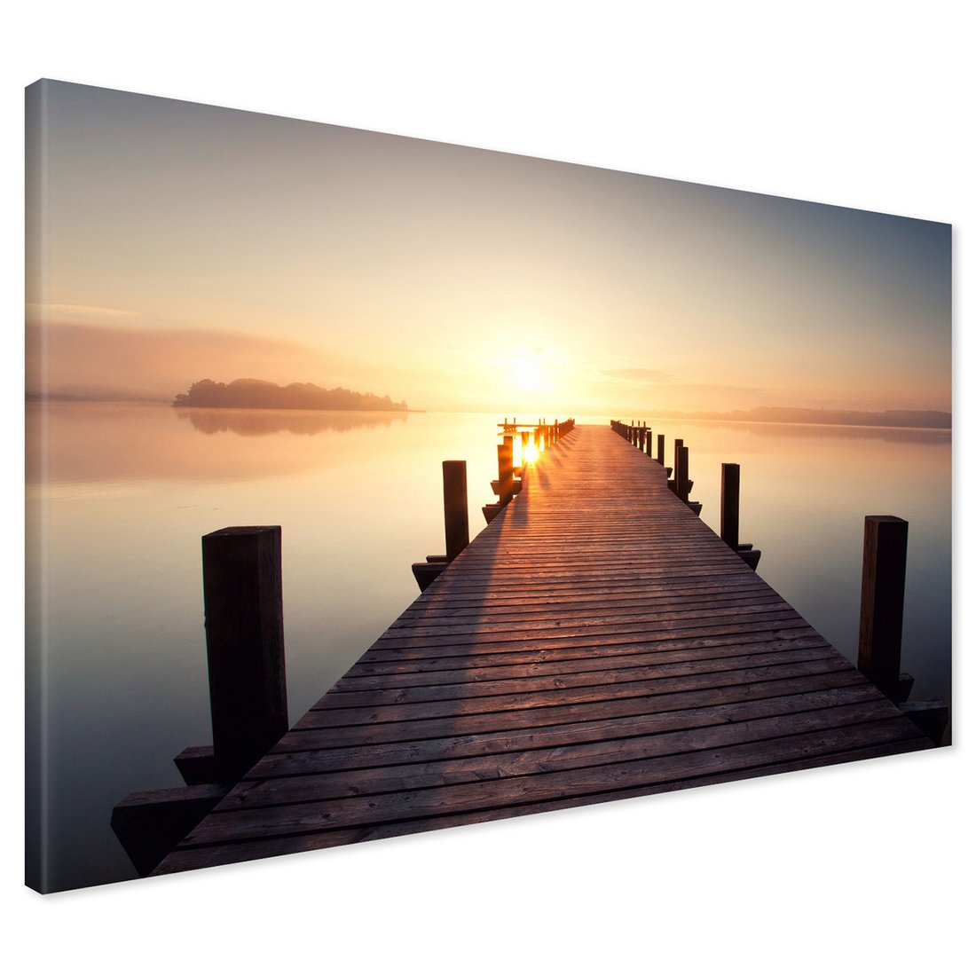 Obraz na płótnie z motywem jezioro, pomost, wschód słońca to kwintesencja estetyki i trwałości. Dzięki łatwemu montażowi i uniwersalnemu wzornictwu, czyni go idealnym wyborem zarówno do codziennego użytku, jak i na wyrafinowany prezent.