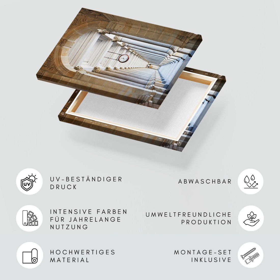 Obraz na płótnie z motywem kolumnada, architektura, zegar to kwintesencja estetyki i trwałości. Dzięki łatwemu montażowi i uniwersalnemu wzornictwu, czyni go idealnym wyborem zarówno do codziennego użytku, jak i na wyrafinowany prezent.
