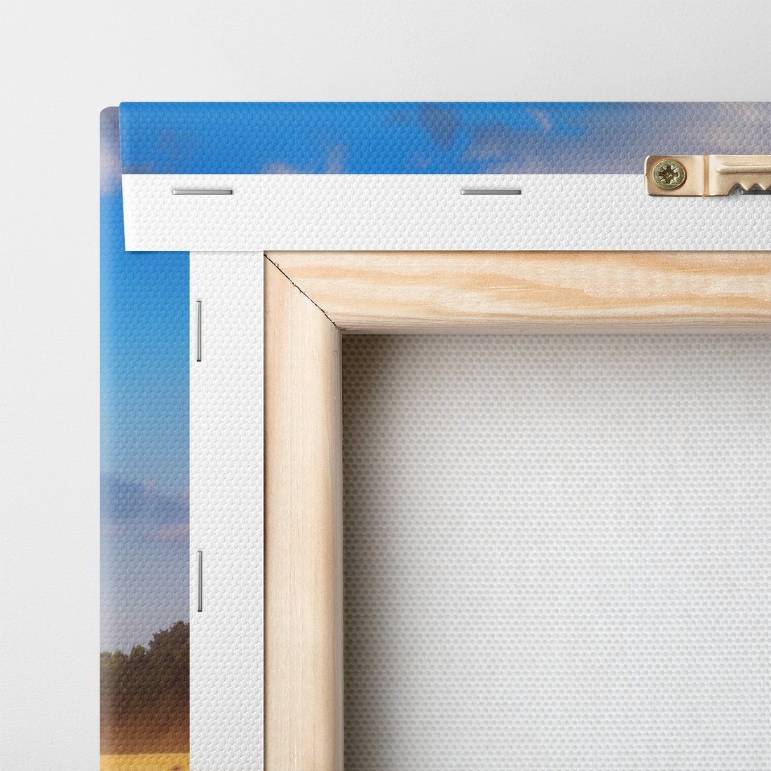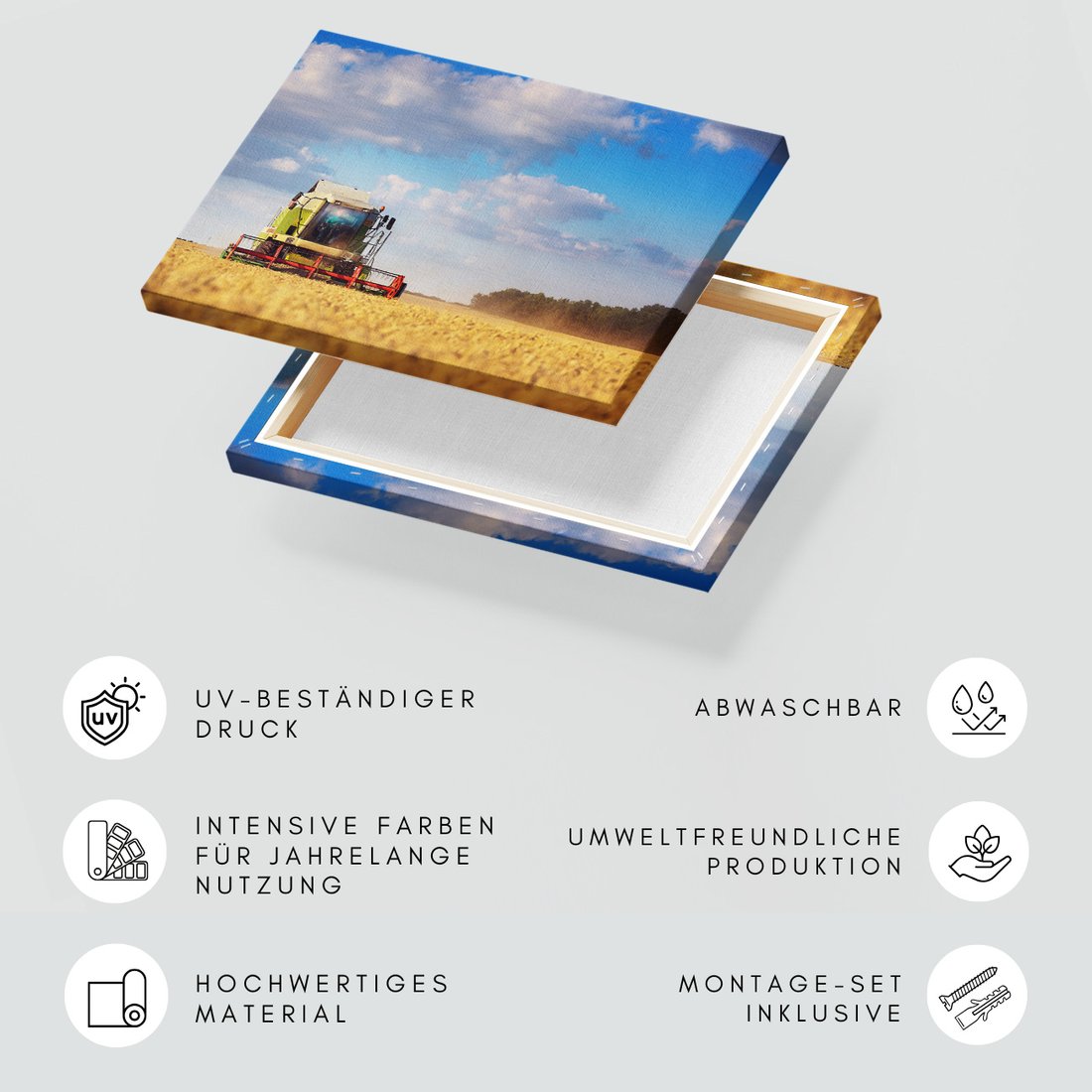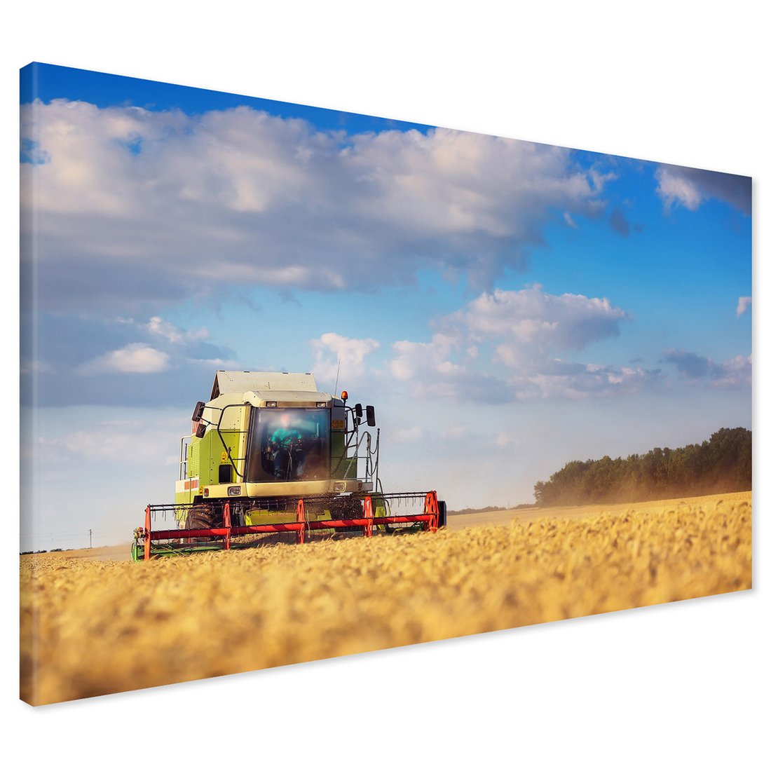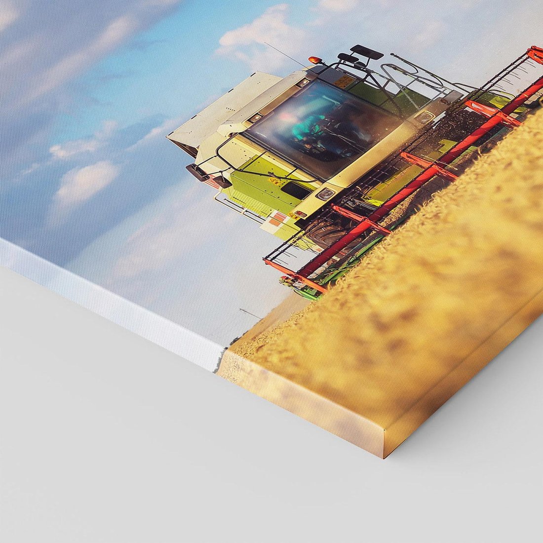 Obraz na płótnie z motywem Kombajn, Pole, Niebo to kwintesencja estetyki i trwałości. Dzięki łatwemu montażowi i uniwersalnemu wzornictwu, czyni go idealnym wyborem zarówno do codziennego użytku, jak i na wyrafinowany prezent.