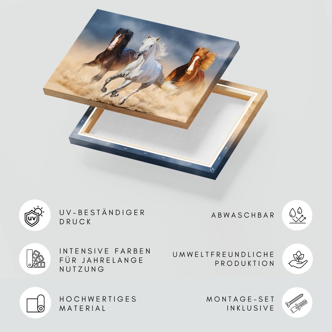 Obraz na płótnie z motywem konie, galop, piasek to kwintesencja estetyki i trwałości. Dzięki łatwemu montażowi i uniwersalnemu wzornictwu, czyni go idealnym wyborem zarówno do codziennego użytku, jak i na wyrafinowany prezent.