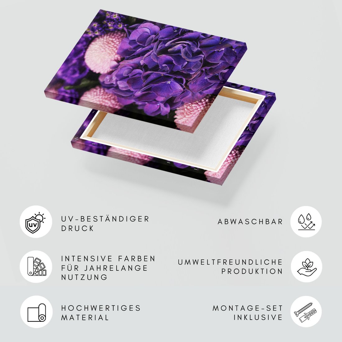 Obraz na płótnie z motywem kwiaty, fioletowy, bukiet to kwintesencja estetyki i trwałości. Dzięki łatwemu montażowi i uniwersalnemu wzornictwu, czyni go idealnym wyborem zarówno do codziennego użytku, jak i na wyrafinowany prezent.