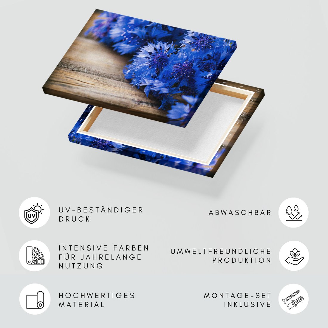 Obraz na płótnie z motywem kwiaty, niebieski, drewno to kwintesencja estetyki i trwałości. Dzięki łatwemu montażowi i uniwersalnemu wzornictwu, czyni go idealnym wyborem zarówno do codziennego użytku, jak i na wyrafinowany prezent.