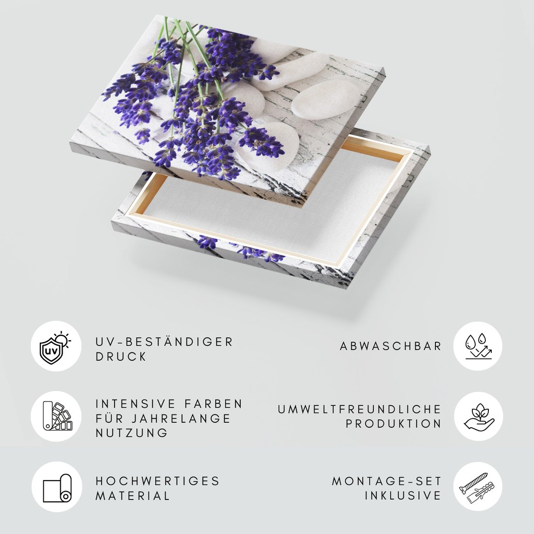 Obraz na płótnie z motywem lawenda, kamienie, kwiaty to kwintesencja estetyki i trwałości. Dzięki łatwemu montażowi i uniwersalnemu wzornictwu, czyni go idealnym wyborem zarówno do codziennego użytku, jak i na wyrafinowany prezent.