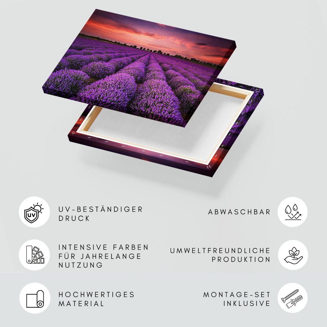 Obraz na płótnie z motywem lawenda, pole, zachód słońca to kwintesencja estetyki i trwałości. Dzięki łatwemu montażowi i uniwersalnemu wzornictwu, czyni go idealnym wyborem zarówno do codziennego użytku, jak i na wyrafinowany prezent.