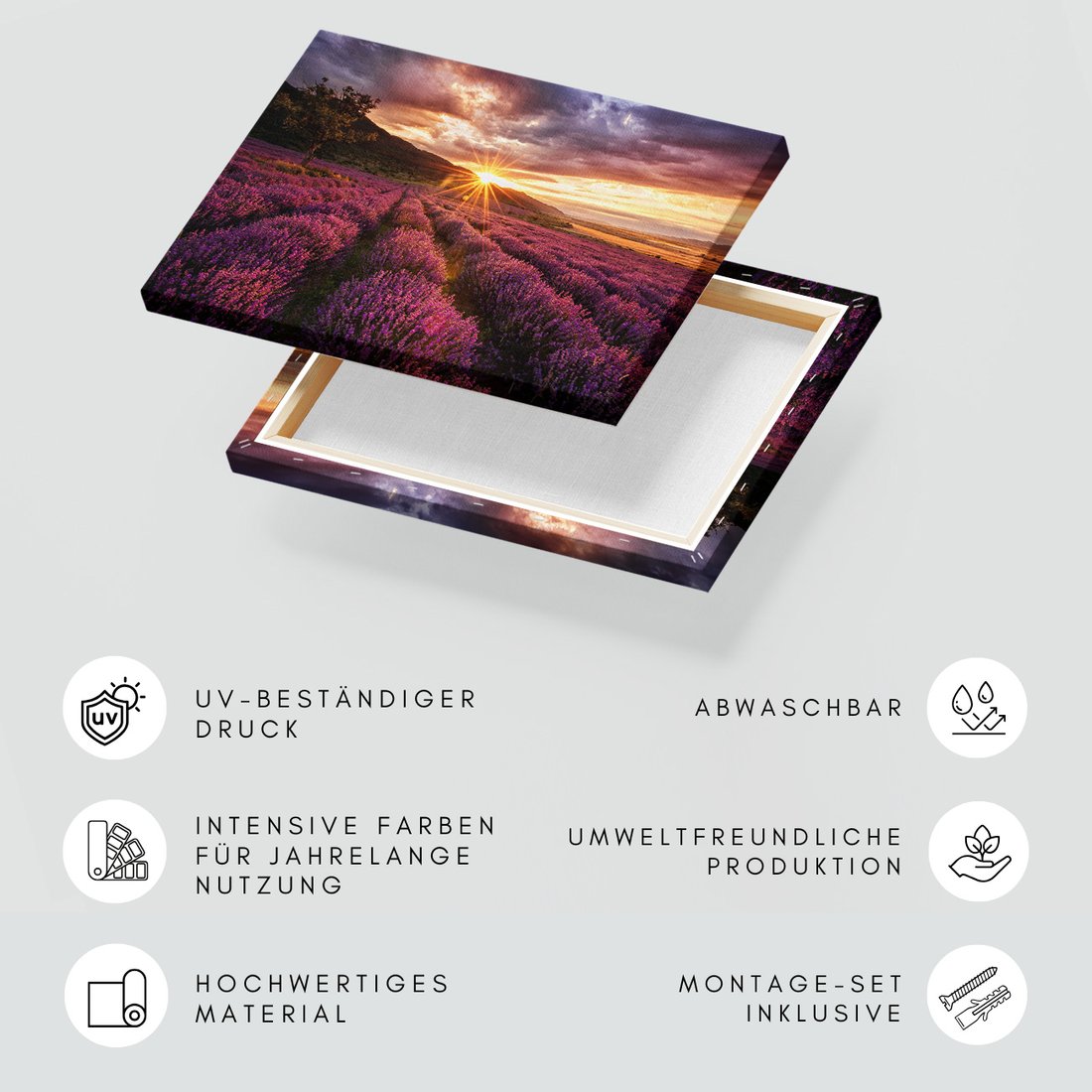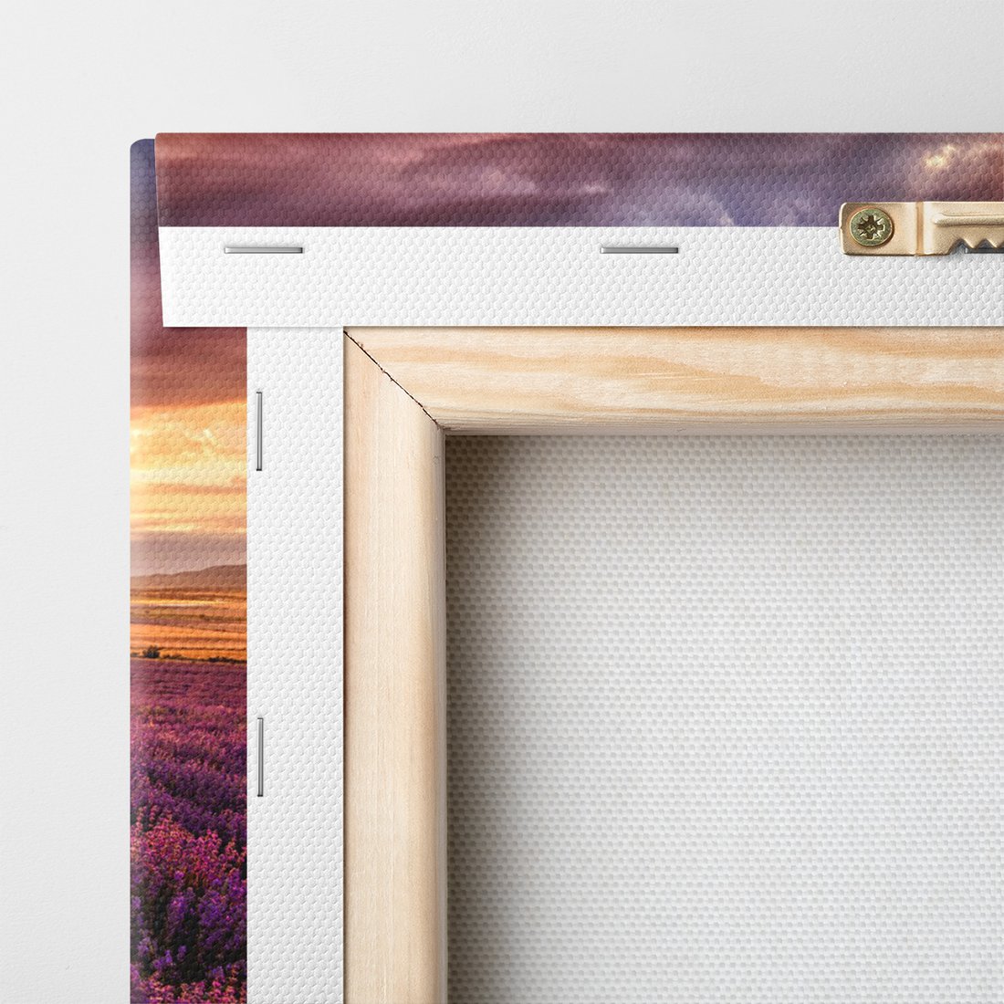 Obraz na płótnie z motywem lawenda, pole, zachód słońca to kwintesencja estetyki i trwałości. Dzięki łatwemu montażowi i uniwersalnemu wzornictwu, czyni go idealnym wyborem zarówno do codziennego użytku, jak i na wyrafinowany prezent.