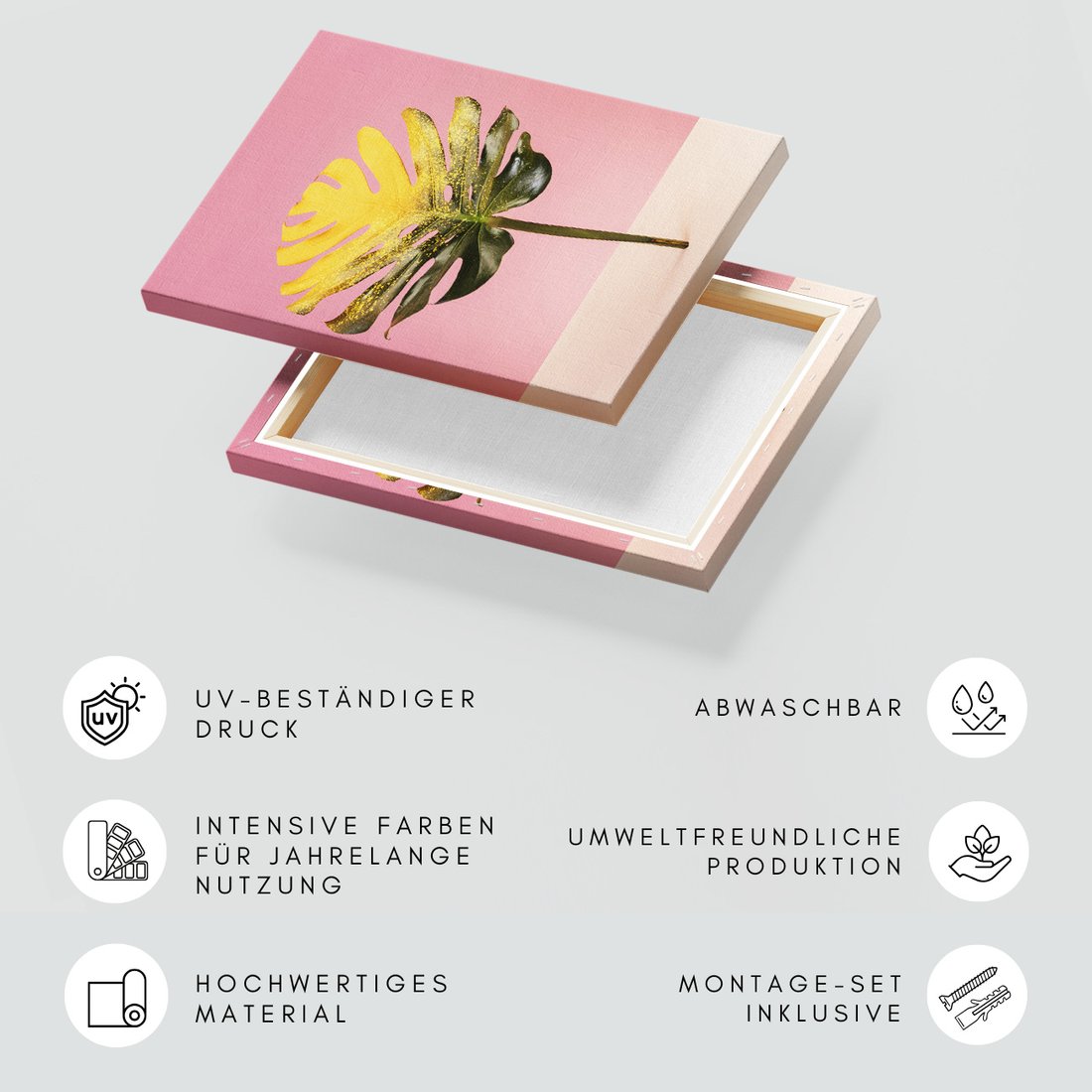 Obraz na płótnie z motywem liść, monstera, złoto to kwintesencja estetyki i trwałości. Dzięki łatwemu montażowi i uniwersalnemu wzornictwu, czyni go idealnym wyborem zarówno do codziennego użytku, jak i na wyrafinowany prezent.