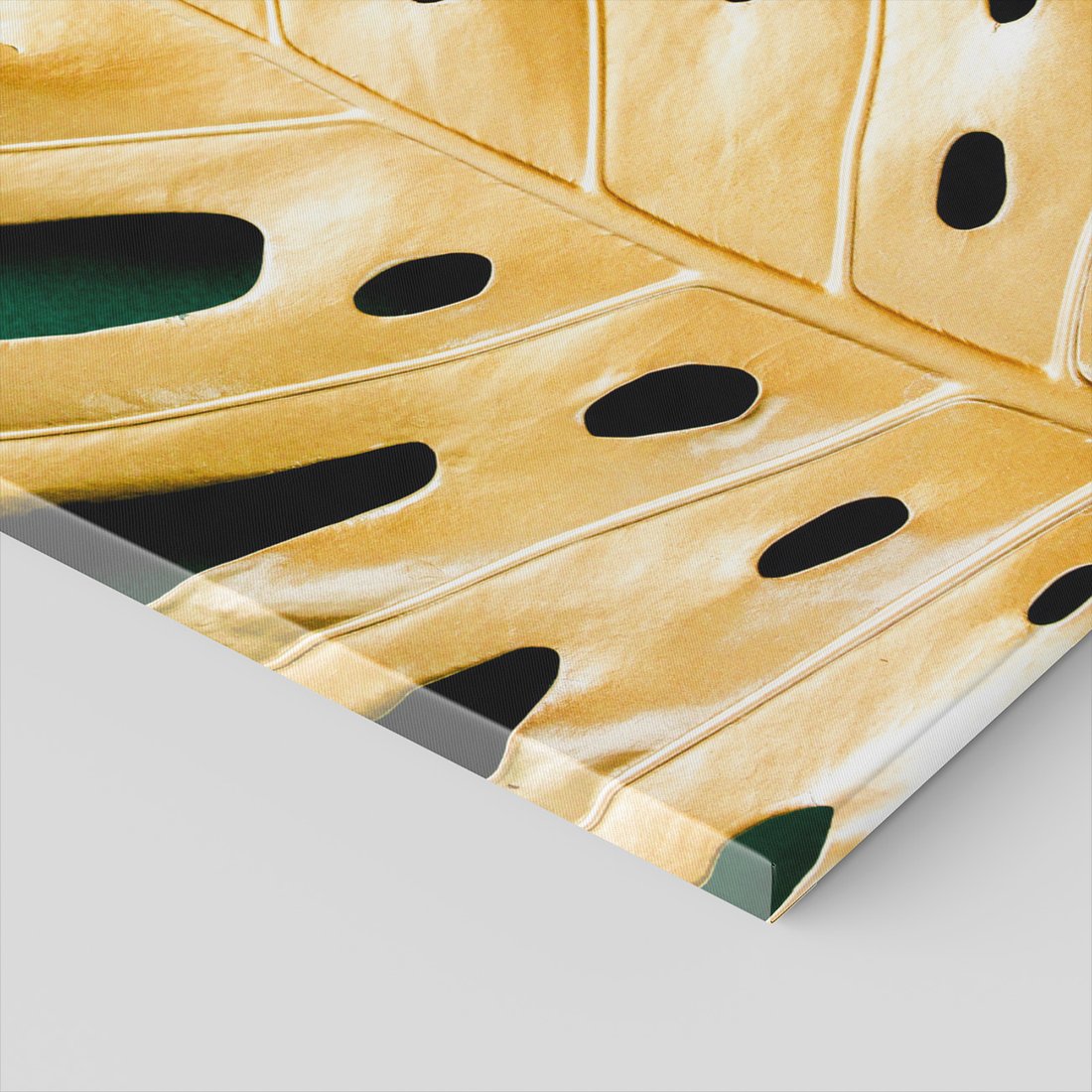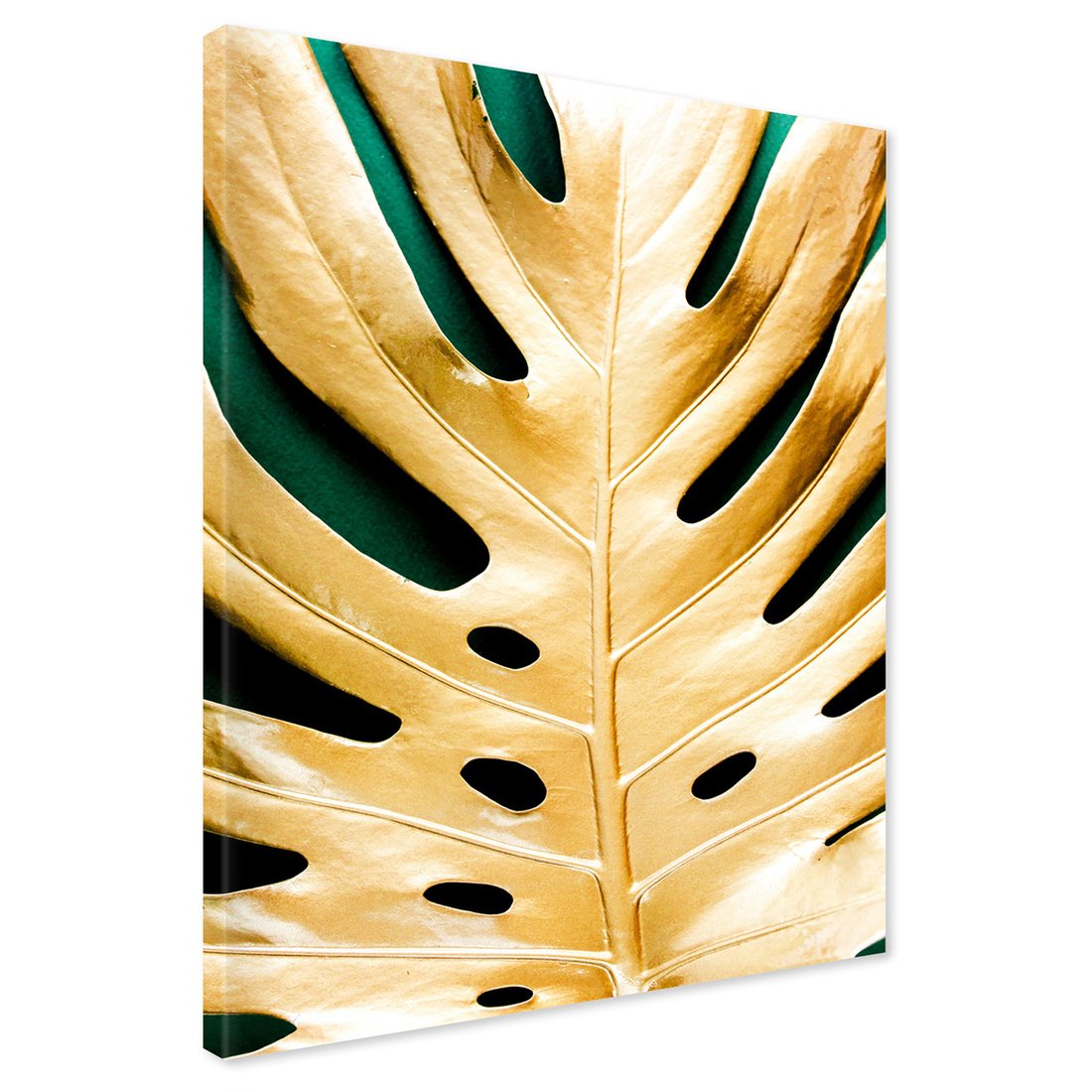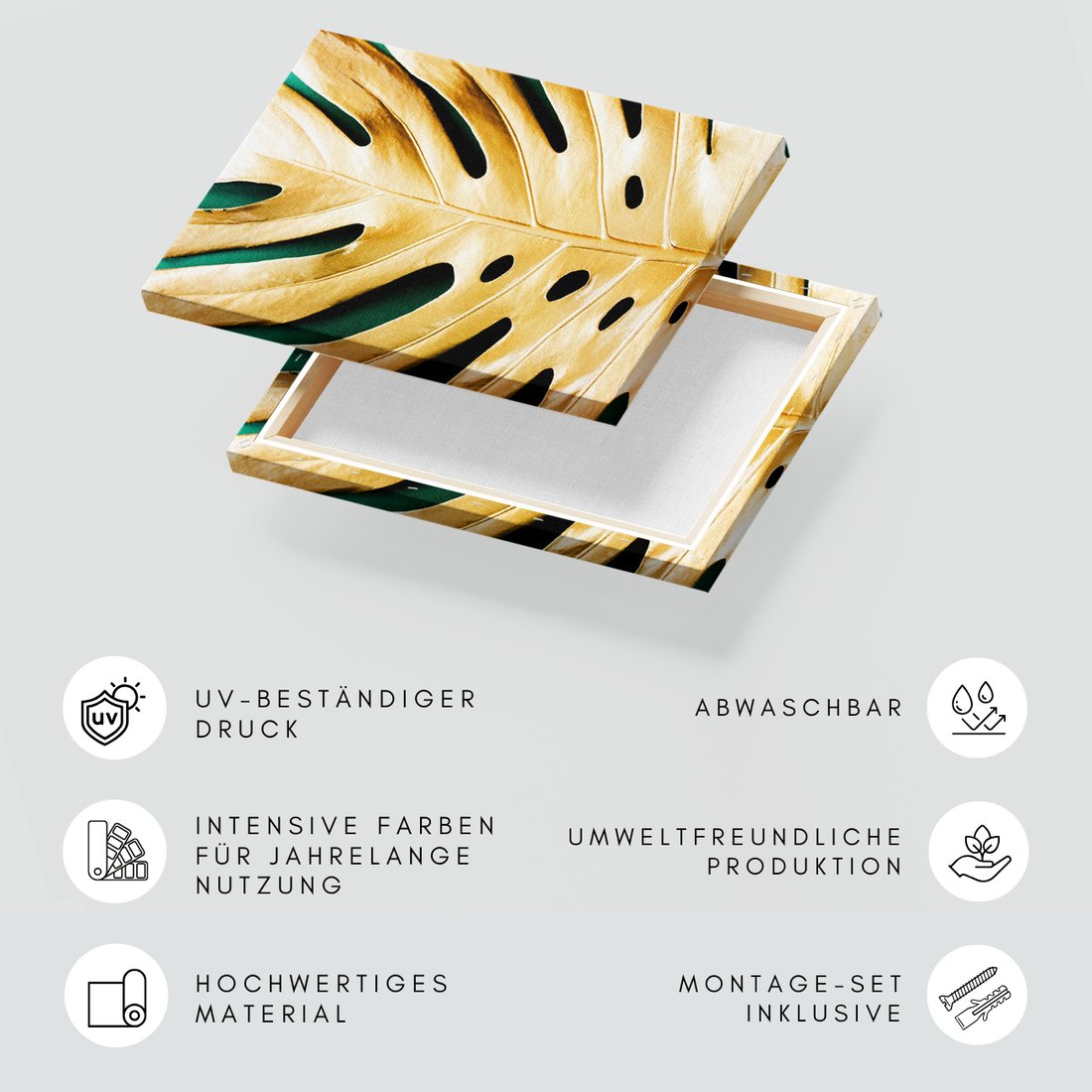 Obraz na płótnie z motywem liść, złoto, monstera to kwintesencja estetyki i trwałości. Dzięki łatwemu montażowi i uniwersalnemu wzornictwu, czyni go idealnym wyborem zarówno do codziennego użytku, jak i na wyrafinowany prezent.