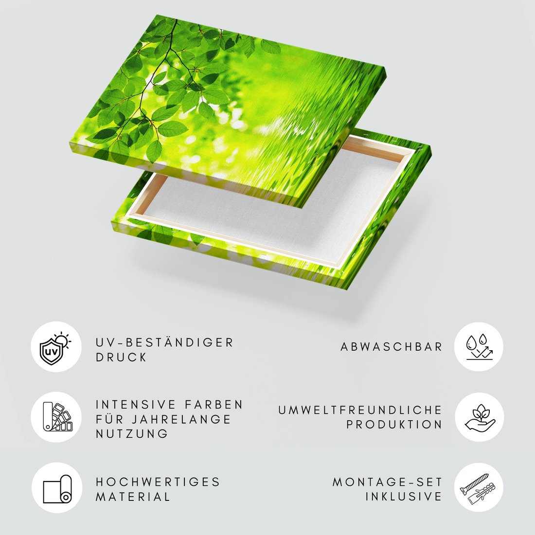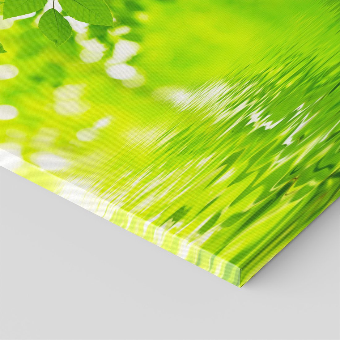 Obraz na płótnie z motywem liście, woda, zieleń to kwintesencja estetyki i trwałości. Dzięki łatwemu montażowi i uniwersalnemu wzornictwu, czyni go idealnym wyborem zarówno do codziennego użytku, jak i na wyrafinowany prezent.