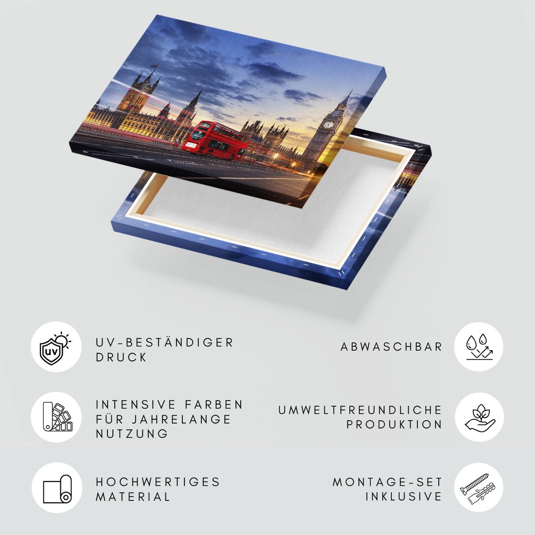 Obraz na płótnie z motywem Londyn, autobus, Big Ben to kwintesencja estetyki i trwałości. Dzięki łatwemu montażowi i uniwersalnemu wzornictwu, czyni go idealnym wyborem zarówno do codziennego użytku, jak i na wyrafinowany prezent.