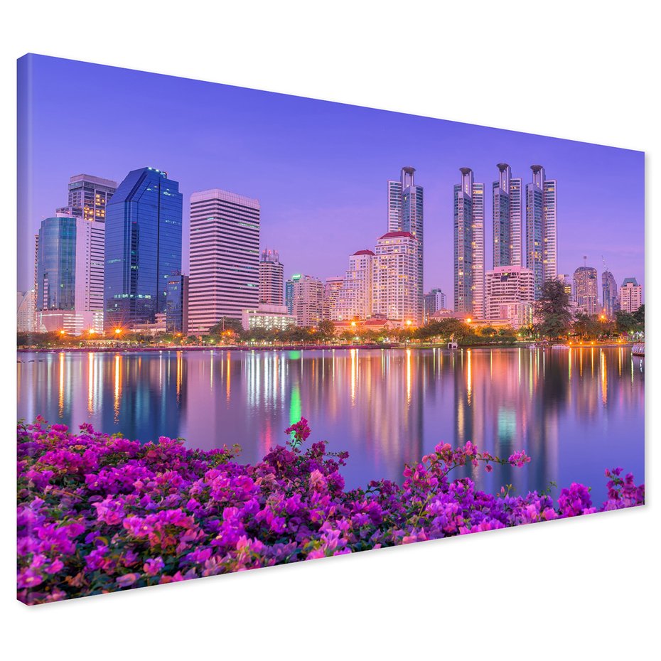 Obraz na płótnie - miasto, kwiaty, odbicie