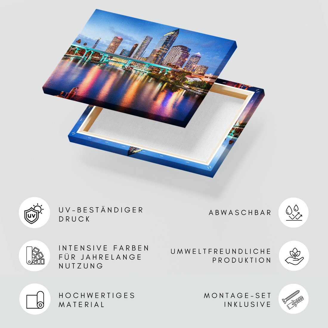 Obraz na płótnie z motywem miasto, most, woda to kwintesencja estetyki i trwałości. Dzięki łatwemu montażowi i uniwersalnemu wzornictwu, czyni go idealnym wyborem zarówno do codziennego użytku, jak i na wyrafinowany prezent.