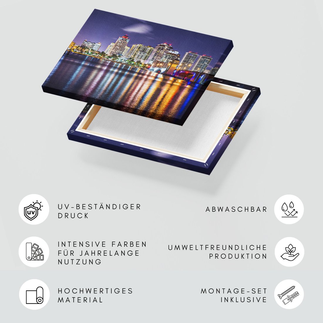 Obraz na płótnie z motywem miasto, noc, woda to kwintesencja estetyki i trwałości. Dzięki łatwemu montażowi i uniwersalnemu wzornictwu, czyni go idealnym wyborem zarówno do codziennego użytku, jak i na wyrafinowany prezent.