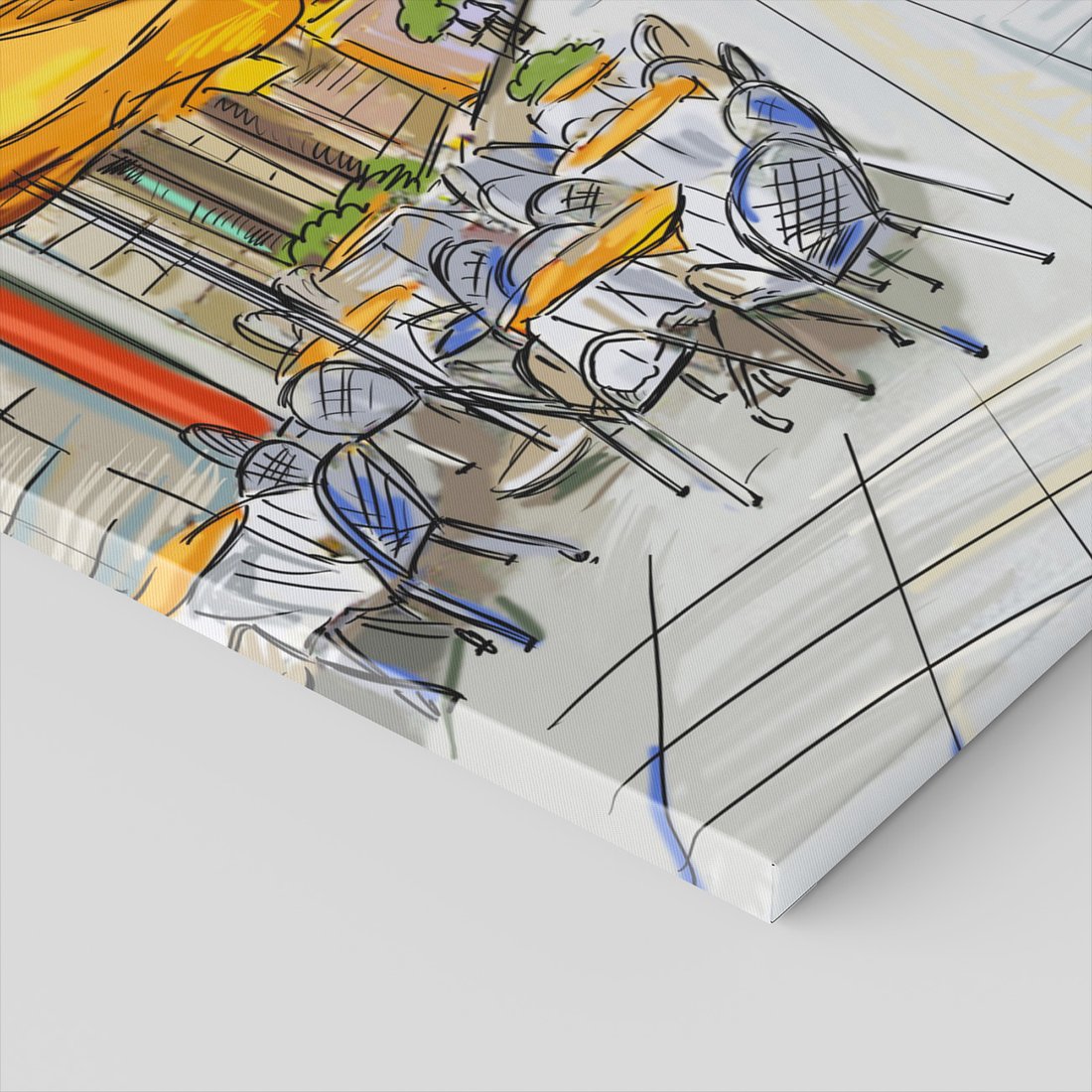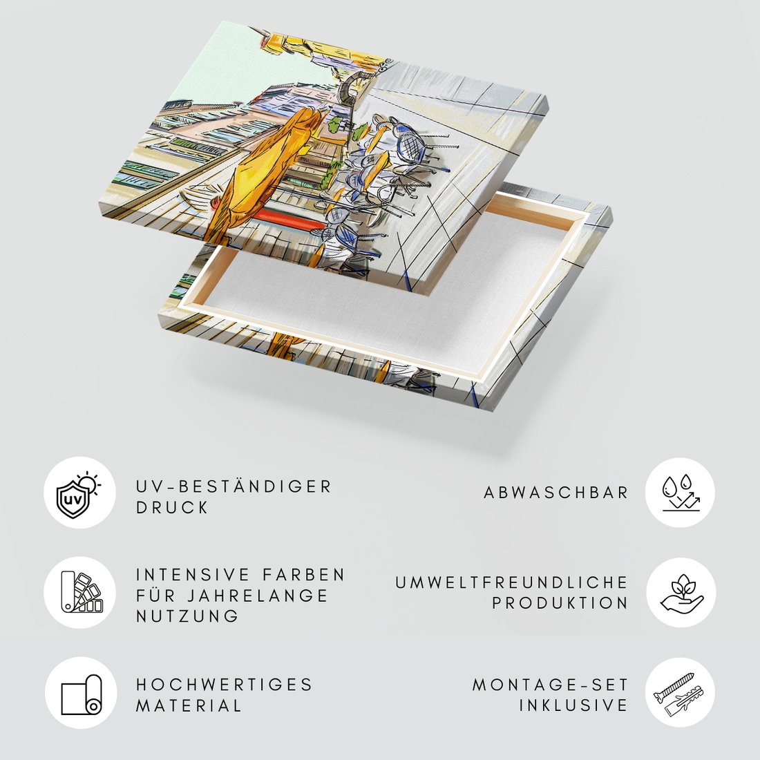 Obraz na płótnie z motywem miasto,ulica,kawiarnia to kwintesencja estetyki i trwałości. Dzięki łatwemu montażowi i uniwersalnemu wzornictwu, czyni go idealnym wyborem zarówno do codziennego użytku, jak i na wyrafinowany prezent.