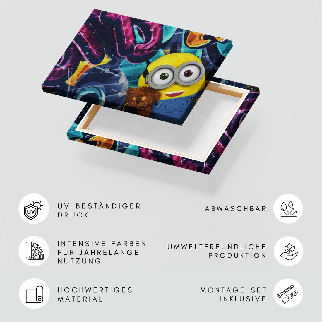 Obraz na płótnie z motywem Minionek, Graffiti, Pluszak to kwintesencja estetyki i trwałości. Dzięki łatwemu montażowi i uniwersalnemu wzornictwu, czyni go idealnym wyborem zarówno do codziennego użytku, jak i na wyrafinowany prezent.