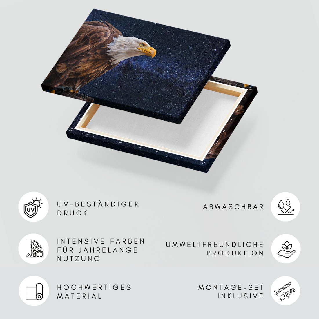 Obraz na płótnie z motywem orzeł, ptak, gwiazdy to kwintesencja estetyki i trwałości. Dzięki łatwemu montażowi i uniwersalnemu wzornictwu, czyni go idealnym wyborem zarówno do codziennego użytku, jak i na wyrafinowany prezent.