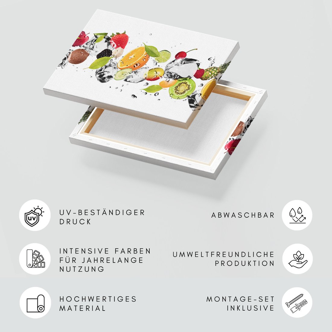 Obraz na płótnie z motywem owoce, lód, świeżość to kwintesencja estetyki i trwałości. Dzięki łatwemu montażowi i uniwersalnemu wzornictwu, czyni go idealnym wyborem zarówno do codziennego użytku, jak i na wyrafinowany prezent.