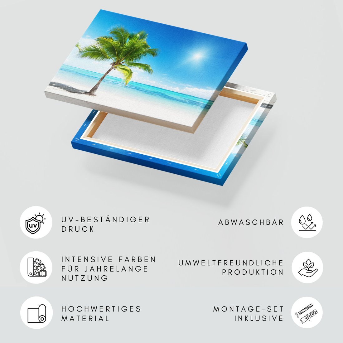 Obraz na płótnie z motywem palma, plaża, morze to kwintesencja estetyki i trwałości. Dzięki łatwemu montażowi i uniwersalnemu wzornictwu, czyni go idealnym wyborem zarówno do codziennego użytku, jak i na wyrafinowany prezent.