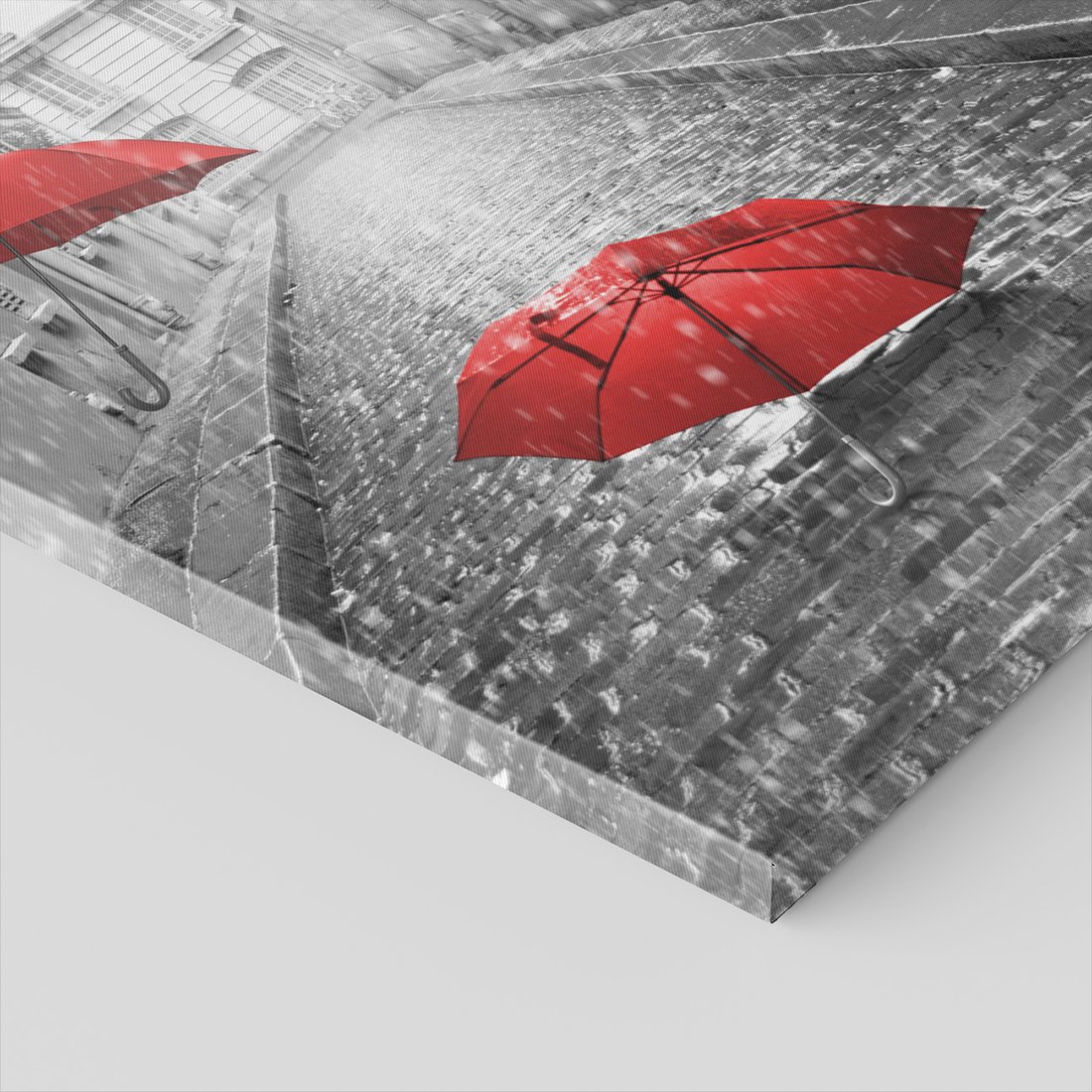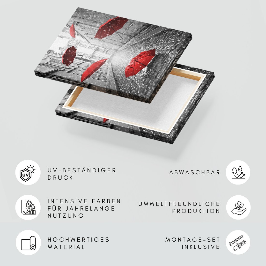 Obraz na płótnie z motywem parasole, deszcz, ulica to kwintesencja estetyki i trwałości. Dzięki łatwemu montażowi i uniwersalnemu wzornictwu, czyni go idealnym wyborem zarówno do codziennego użytku, jak i na wyrafinowany prezent.