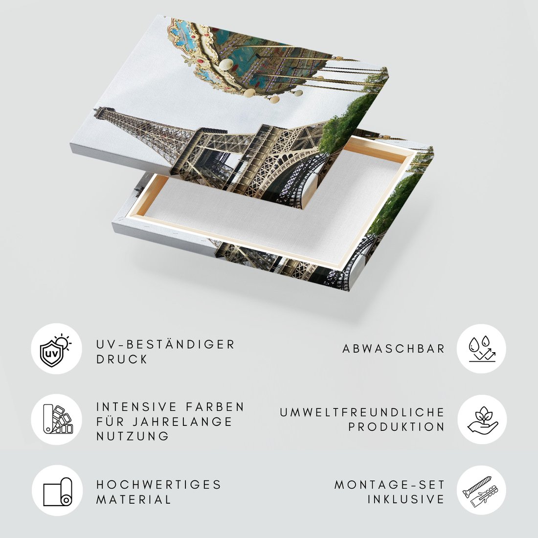 Obraz na płótnie z motywem Paryż, Wieża Eiffla, karuzela to kwintesencja estetyki i trwałości. Dzięki łatwemu montażowi i uniwersalnemu wzornictwu, czyni go idealnym wyborem zarówno do codziennego użytku, jak i na wyrafinowany prezent.