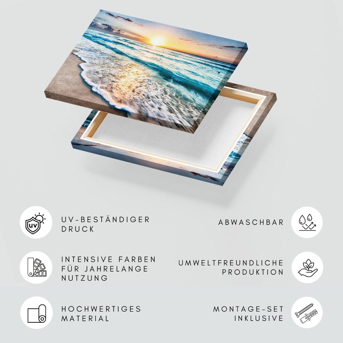 Obraz na płótnie z motywem plaża, morze, zachód słońca to kwintesencja estetyki i trwałości. Dzięki łatwemu montażowi i uniwersalnemu wzornictwu, czyni go idealnym wyborem zarówno do codziennego użytku, jak i na wyrafinowany prezent.
