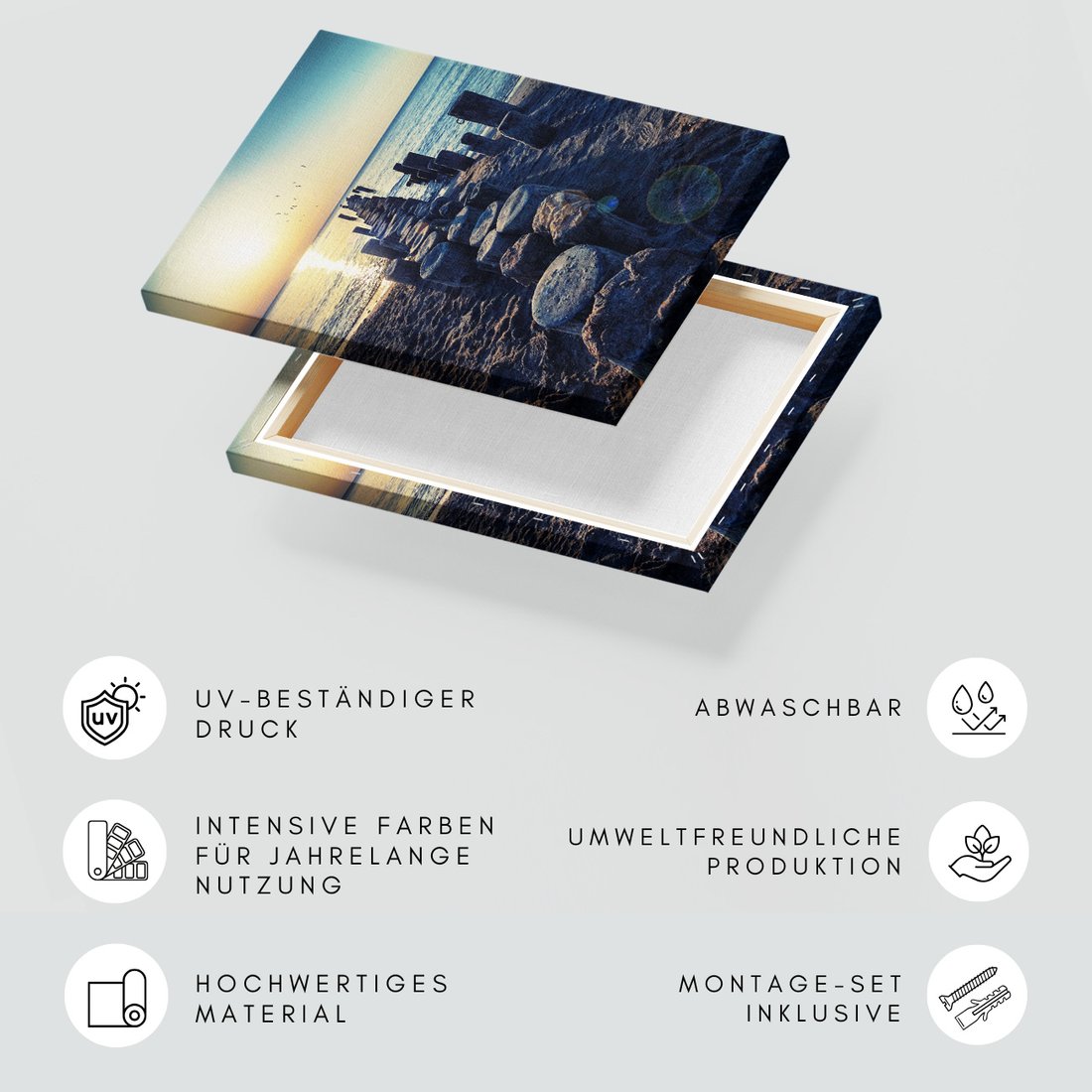 Obraz na płótnie z motywem plaża, morze, zachód słońca to kwintesencja estetyki i trwałości. Dzięki łatwemu montażowi i uniwersalnemu wzornictwu, czyni go idealnym wyborem zarówno do codziennego użytku, jak i na wyrafinowany prezent.