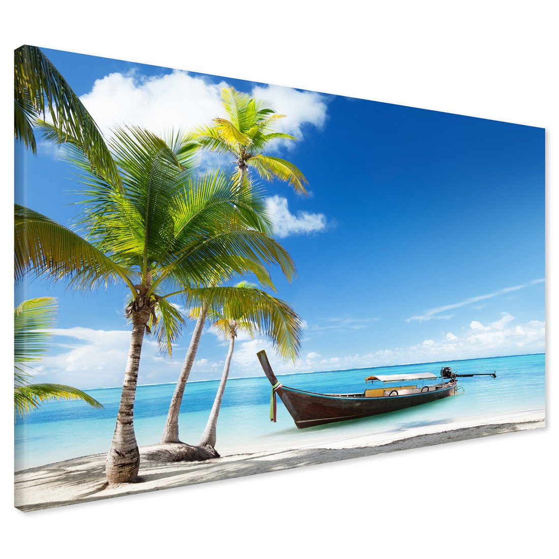 Obraz na płótnie z motywem plaża, palmy, łódź to kwintesencja estetyki i trwałości. Dzięki łatwemu montażowi i uniwersalnemu wzornictwu, czyni go idealnym wyborem zarówno do codziennego użytku, jak i na wyrafinowany prezent.