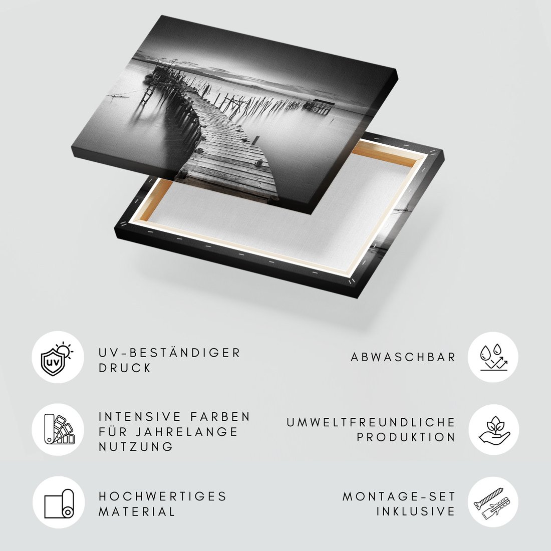 Obraz na płótnie z motywem pomost, woda, czarny i biały to kwintesencja estetyki i trwałości. Dzięki łatwemu montażowi i uniwersalnemu wzornictwu, czyni go idealnym wyborem zarówno do codziennego użytku, jak i na wyrafinowany prezent.