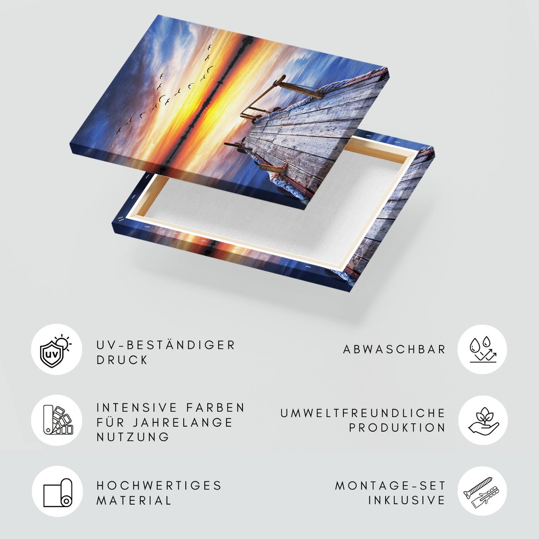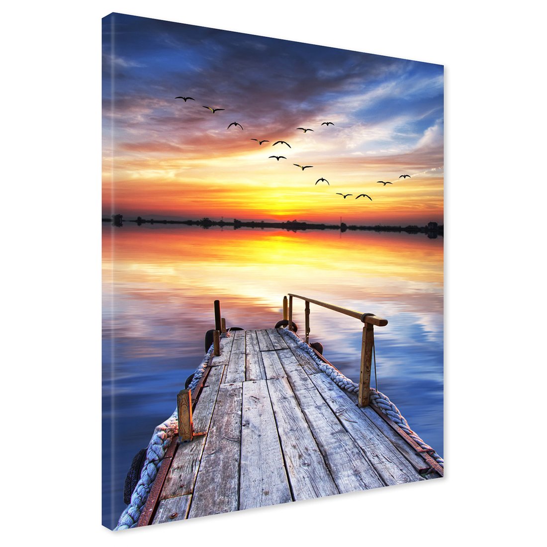 Obraz na płótnie z motywem pomost, zachód słońca, ptaki to kwintesencja estetyki i trwałości. Dzięki łatwemu montażowi i uniwersalnemu wzornictwu, czyni go idealnym wyborem zarówno do codziennego użytku, jak i na wyrafinowany prezent.